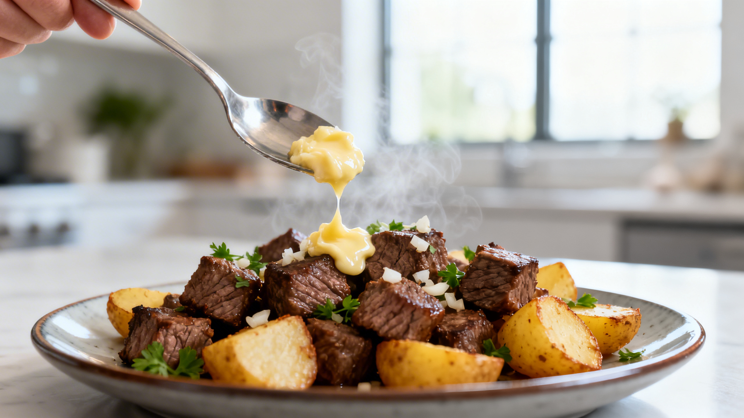 - Toss everything together. Add warm potatoes and steak bites to a large bowl. Pour garlic butter over top and toss gently until glossy and coated.