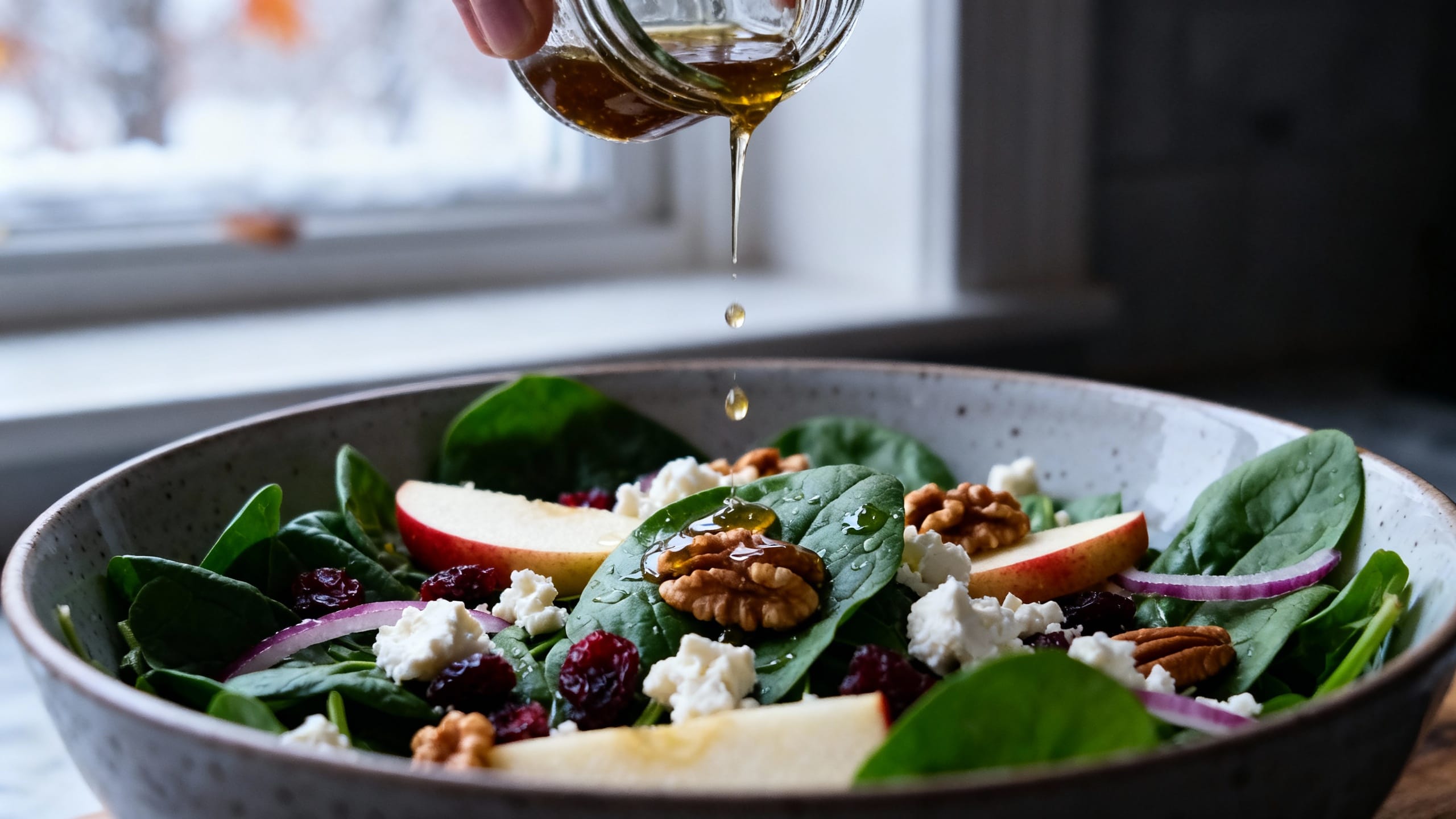 A tangy-sweet vinaigrette is the move. Apple cider vinegar + Dijon + a touch of maple syrup balances the sweet apples and salty feta, and it tastes especially on-theme for fall/winter.