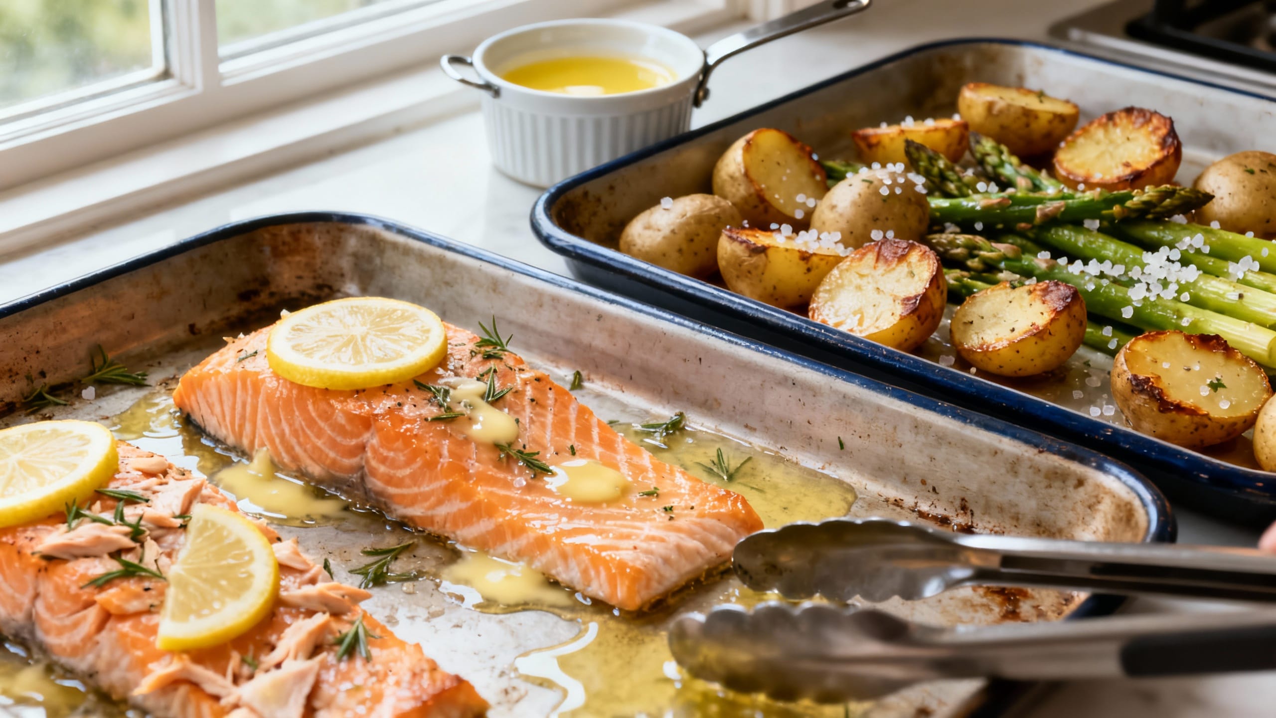 7. Bake everything: put both pans in the oven. Roast for 10–12 minutes, until the salmon flakes easily (about 130–140°F for medium, 145°F for fully cooked) and the asparagus is crisp-tender.