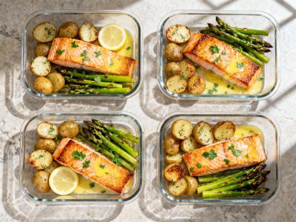 8. Finish and portion: squeeze a little extra lemon over the salmon. Let everything rest 3 minutes, then divide potatoes, asparagus, and salmon into 4 meal prep containers. Add lemon wedges and herbs if you’re feeling fancy.