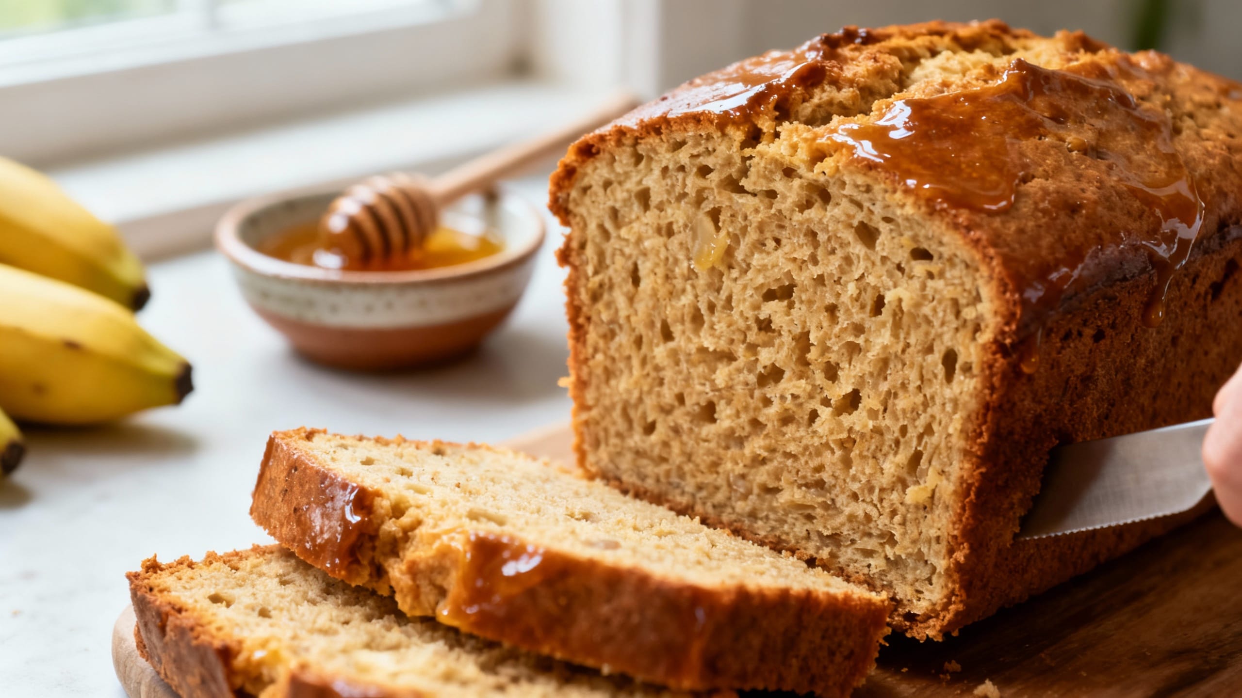 Some banana breads are fine. This one is bakery-style: tall, golden, plush in the middle, and glossy-sweet on top thanks to honey. It tastes like the slice you “accidentally” buy while grabbing coffee, except you made it in your own kitchen.