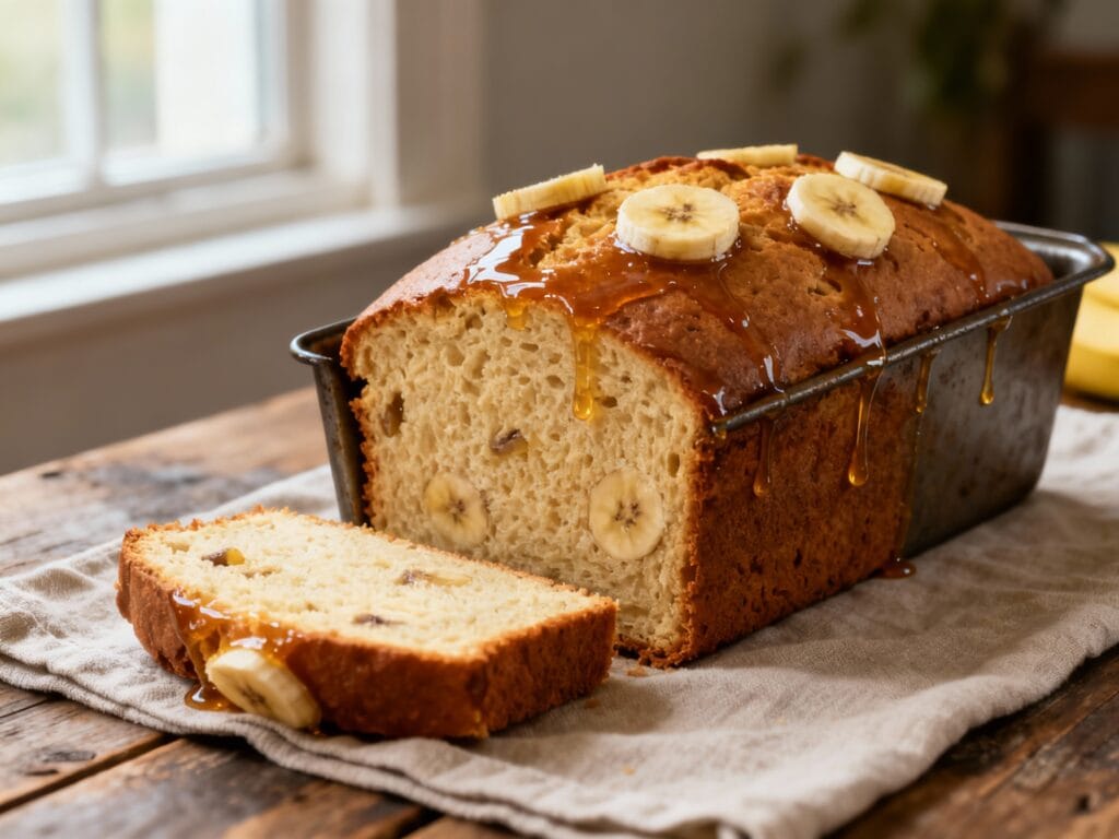 It bakes up thick and lofty with a soft, moist crumb, a lightly caramelized honey top, and that classic banana-bread comfort—easy enough for a weekday, impressive enough to gift or bring to brunch.