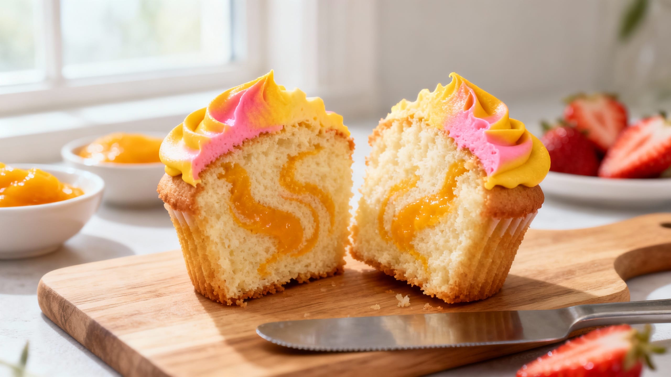 You get big bakery vibes without complicated techniques: tender cupcakes, real fruit flavor (mango + strawberry), and a two-tone frosting that looks impressive but is totally doable at home.