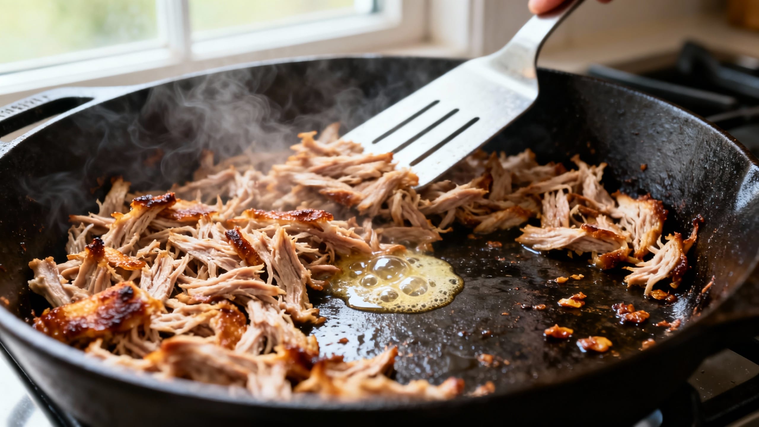- Get it crispy. Spread shredded pork on a sheet pan. Drizzle with 1/3 cup cooking liquid (and a spoonful of fat if you kept it). Broil 3–6 minutes until browned, toss, then broil 2–4 minutes more. Watch closely—broilers go from “perfect” to “oops” fast.