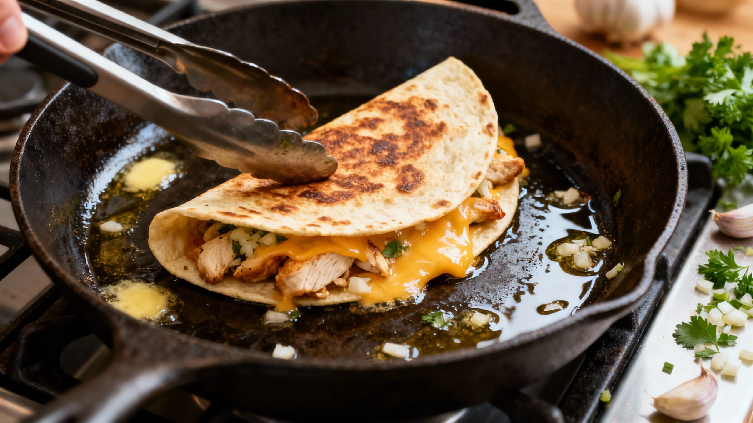 • Use warm chicken (or bring it to room temp). Cold filling takes longer to melt and can make the tortilla over-toast before the inside gets gooey.