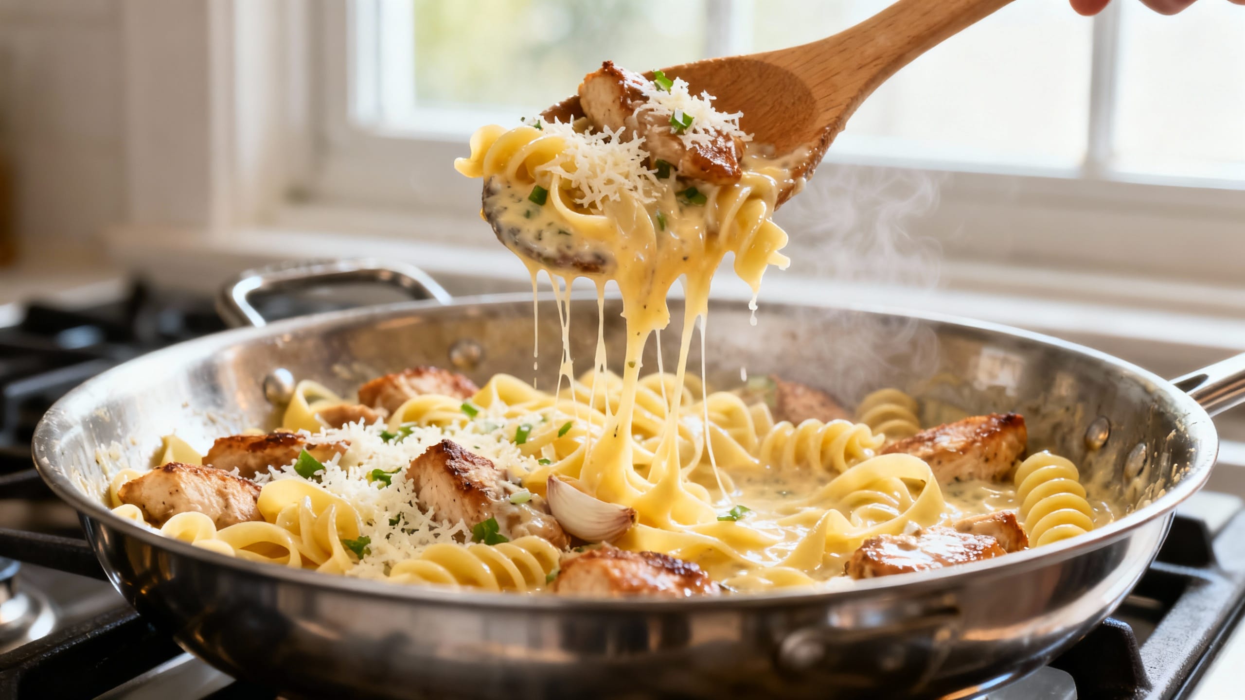 When you want comfort food that tastes like it took way more effort than it did, this is the pasta. We’re talking juicy chicken, a silky garlic-Parmesan sauce, and just enough cheese pull to make everyone “casually” hover near the stove.