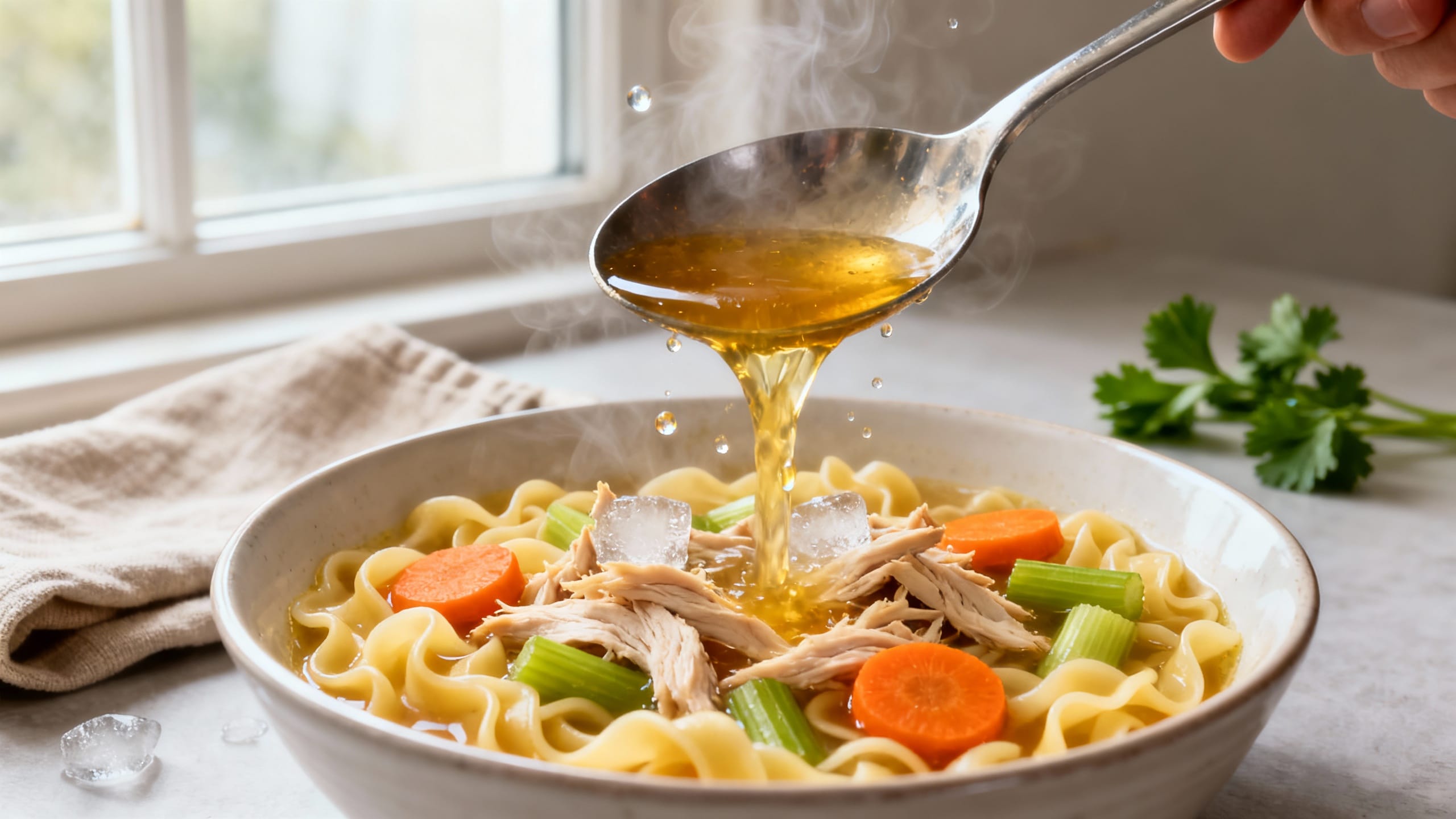 • Rotisserie chicken shortcut: Skip simmering raw chicken. Add 3–4 cups shredded rotisserie chicken after the veggies soften, then simmer 10 minutes before adding noodles.