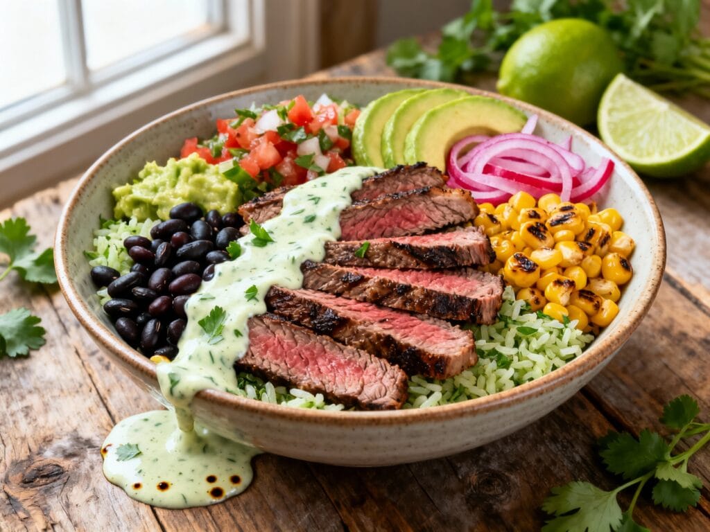Drizzle it over sliced steak and rice, then add toppings like black beans, grilled peppers/onions, corn, pico, and avocado. Finish with an extra squeeze of lime and a pinch of flaky salt on the steak if you want it to taste like it came from your favorite bowl spot.