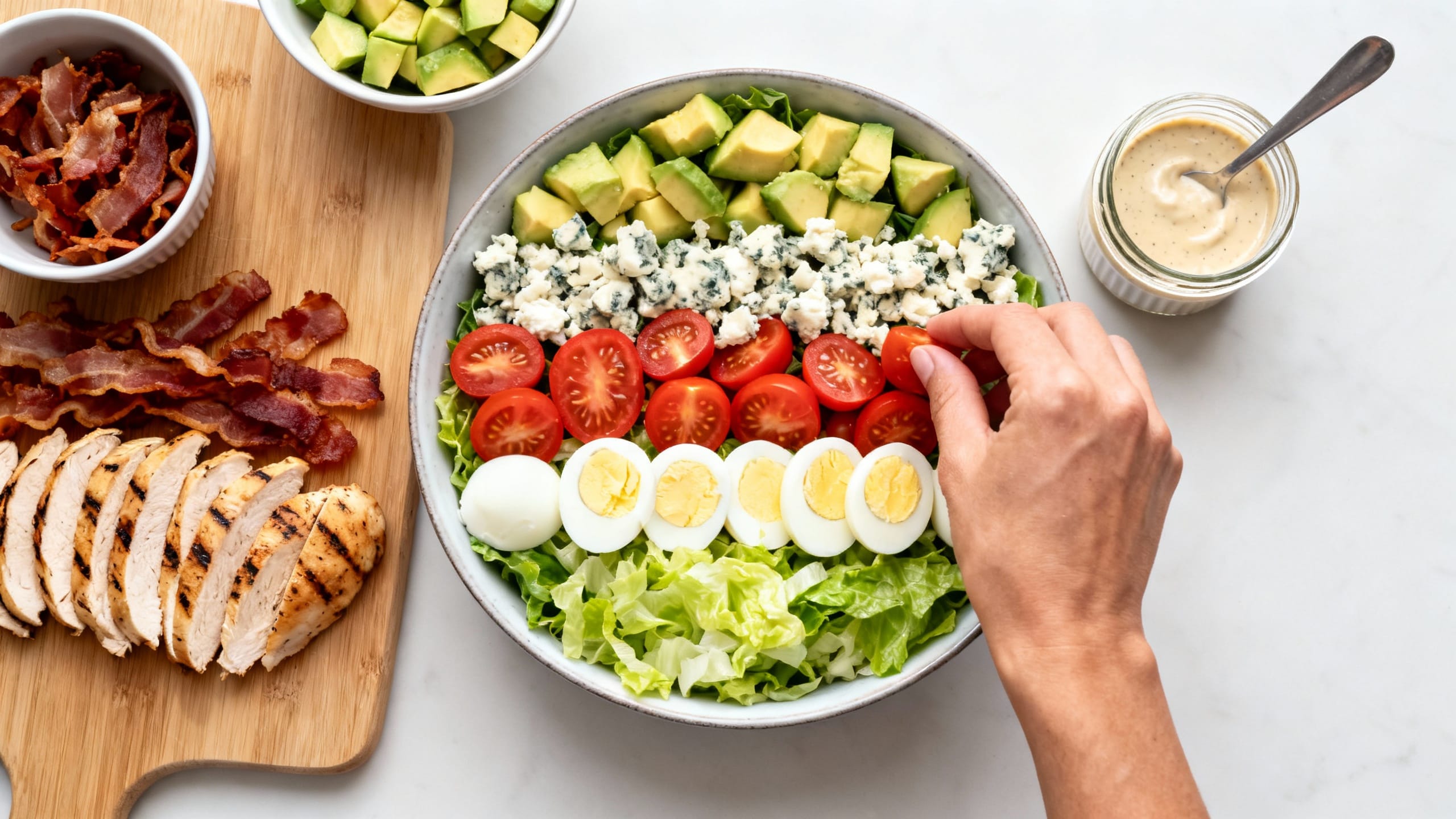 - Build the “restaurant rows.” Arrange chicken, bacon, eggs, avocado, tomatoes, cucumber, onion, and cheese in sections over the greens. This is the classic Cobb look and makes it feel instantly fancy.