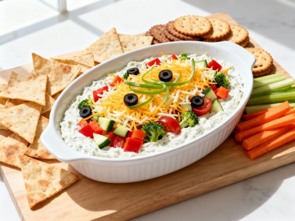 Pita chips and sturdy crackers are top tier because they hold up to the chunky veggies. Bagel chips, pretzel thins, and toasted baguette slices also work great. If you want a fresher option, try cucumber rounds, bell pepper strips, or carrot chips.