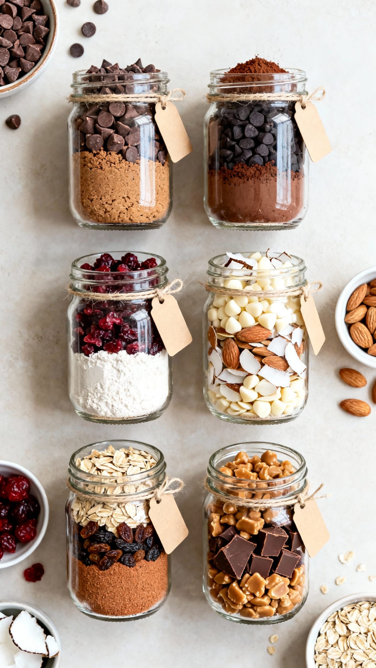 • Layering rule: Put the finest ingredients on the bottom (flour, cocoa, spices), then medium (sugars), then chunky mix-ins on top (chips, nuts). Press each layer gently so it stays crisp and photo-ready.