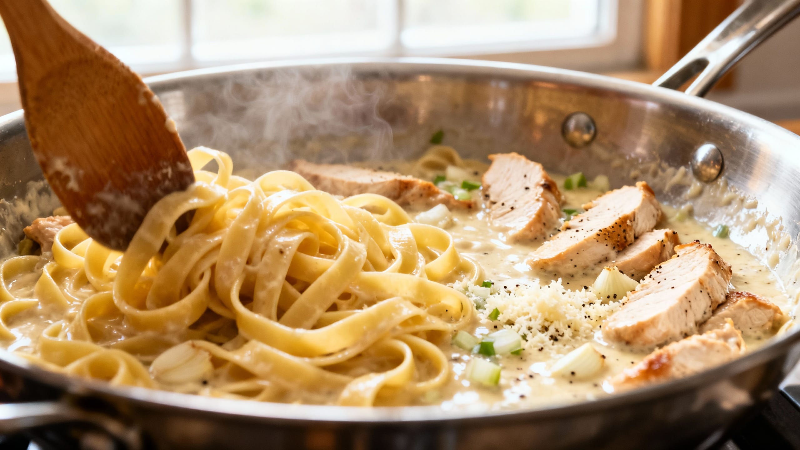This recipe is quick, comforting, and uses simple ingredients, but it still tastes like a “real” restaurant pasta moment—juicy chicken, a silky garlic-Parmesan sauce, and noodles that hold onto every bit of flavor.