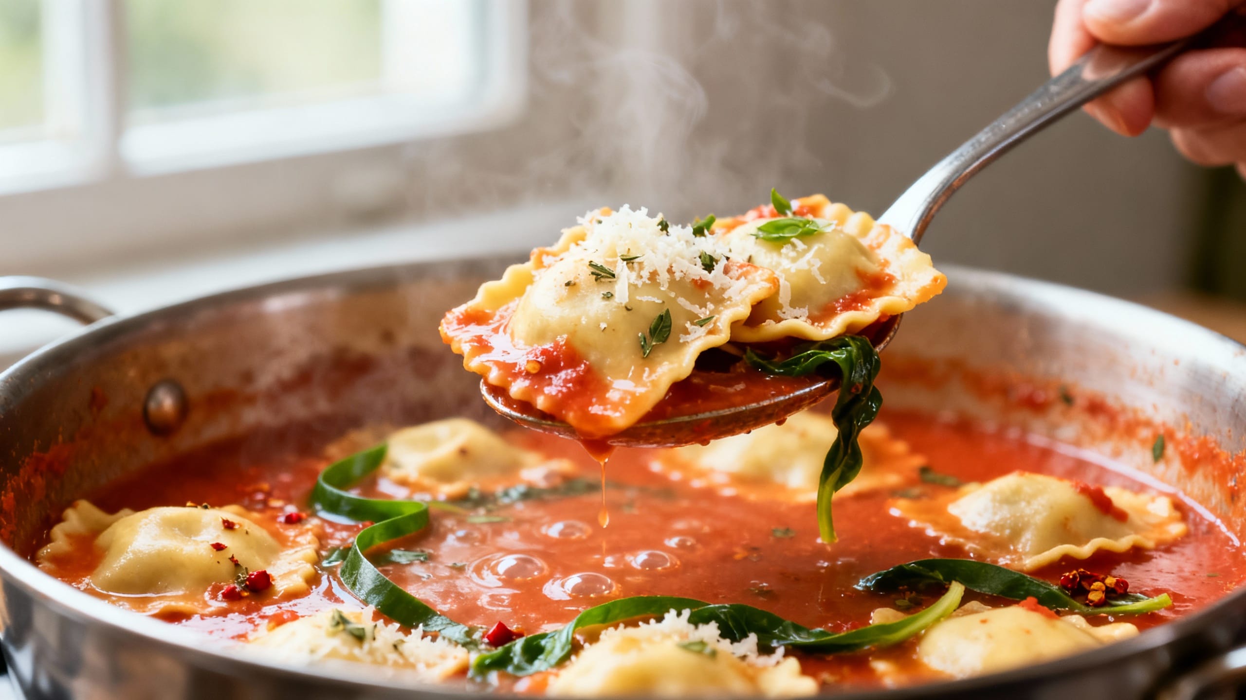 - Add the ravioli to the pot and simmer according to package timing, usually 4–6 minutes, stirring gently so they don’t stick. Keep it at a gentle simmer—ravioli can get delicate if it’s raging boiling.