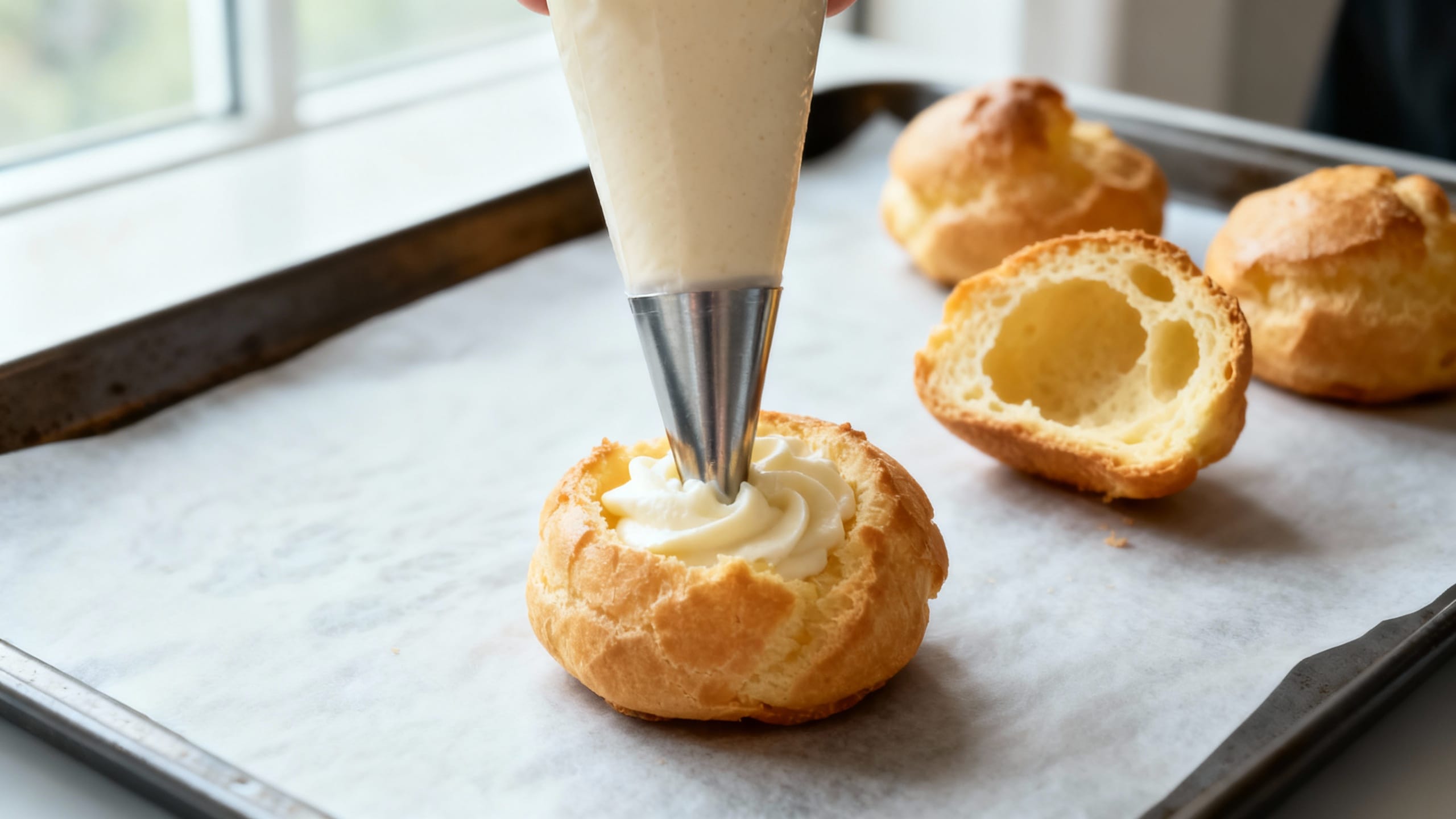- Fill and finish. Slice puffs in half or poke a hole in the bottom. Pipe or spoon in the cream. Dust with powdered sugar right before serving.