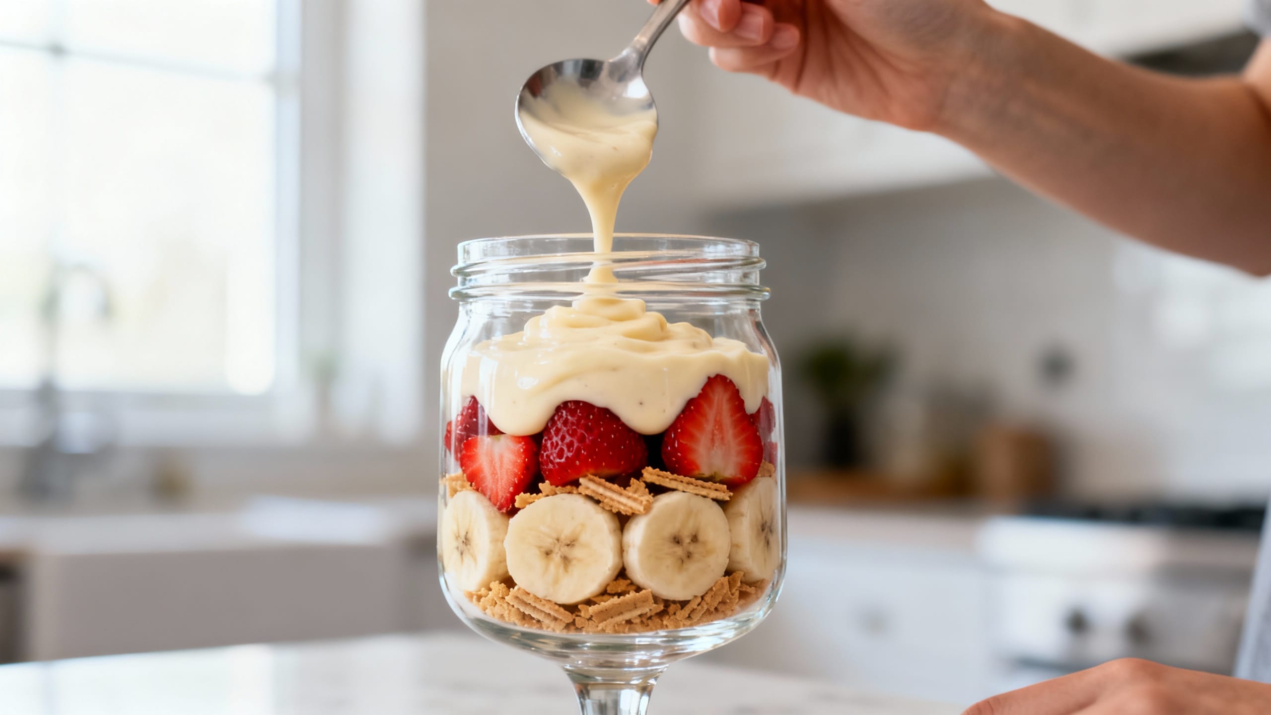 - Set up your layering station: pudding mixture, jam, sliced bananas, sliced strawberries, and cookies. If using freeze-dried strawberries, have them ready for sprinkling between layers.