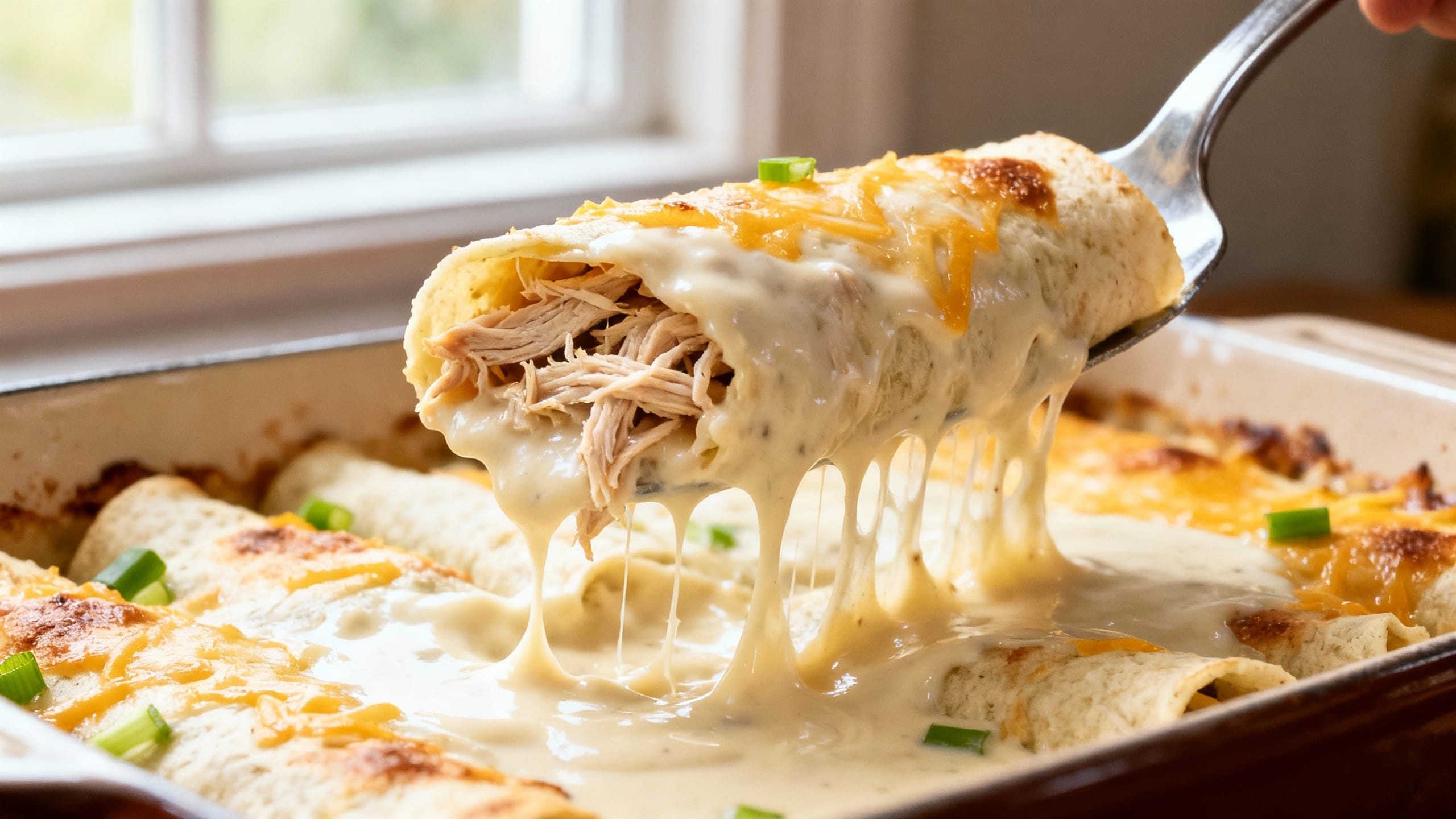 These creamy white chicken enchiladas hit that restaurant-quality sweet spot: tender chicken, gooey cheese, and a smooth, savory white sauce with just enough tang. They’re simple enough for a weeknight but impressive enough to serve when you want people to think you tried really hard.