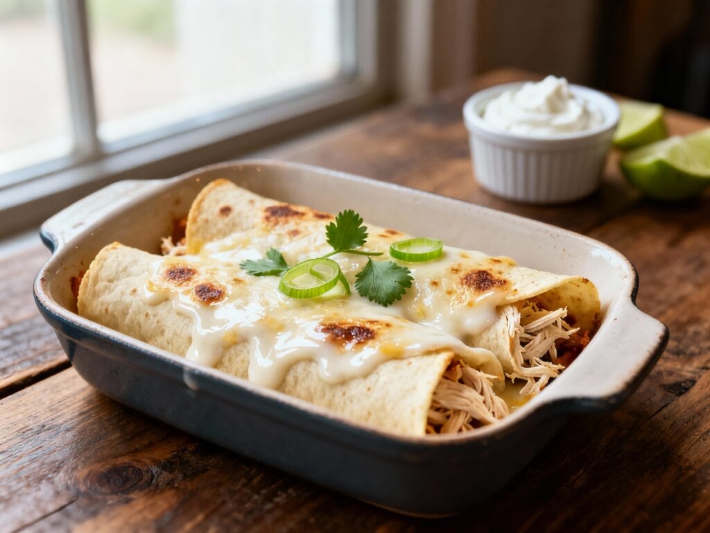 If you’ve ever ordered white chicken enchiladas and thought, “Okay wait… how are these so creamy and good?” this is that vibe—except you’re making it at home in comfy clothes. These enchiladas are rich, melty, and cozy, with a tangy white sauce that tastes like it came from a restaurant skillet, not your weeknight schedule.