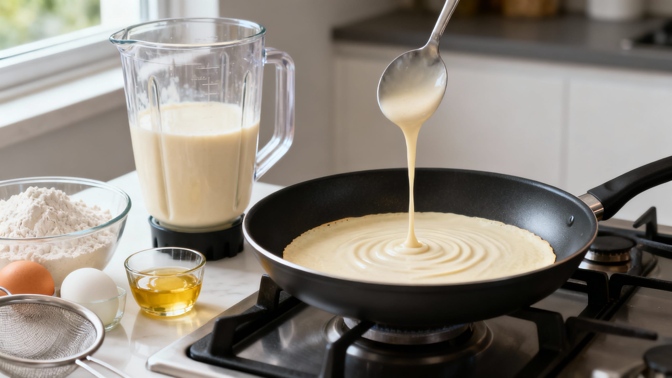 - Blender first, flour second: Liquids first is the real secret to zero lumps. If you don’t have a blender, use an immersion blender in a tall cup.