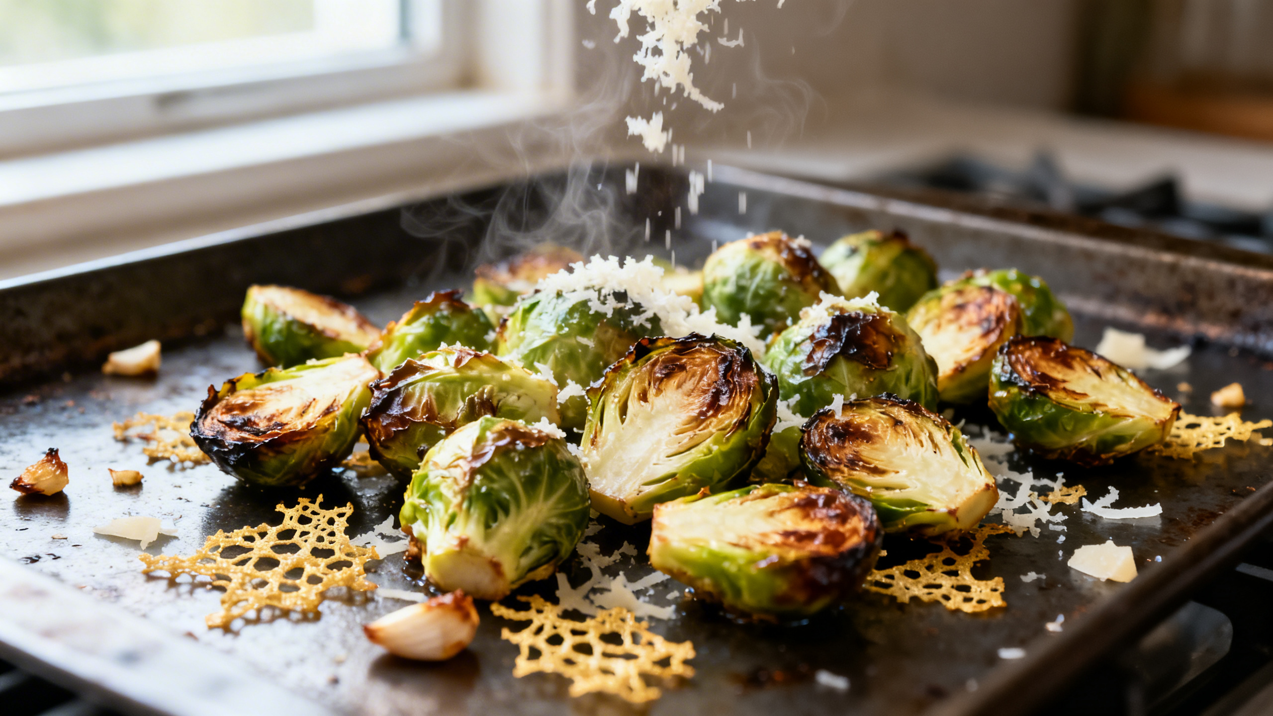 - Remove the pan from the oven and immediately toss the hot sprouts with the garlic-butter mixture and Parmesan. The heat will melt the cheese onto the sprouts like a salty, savory hug.