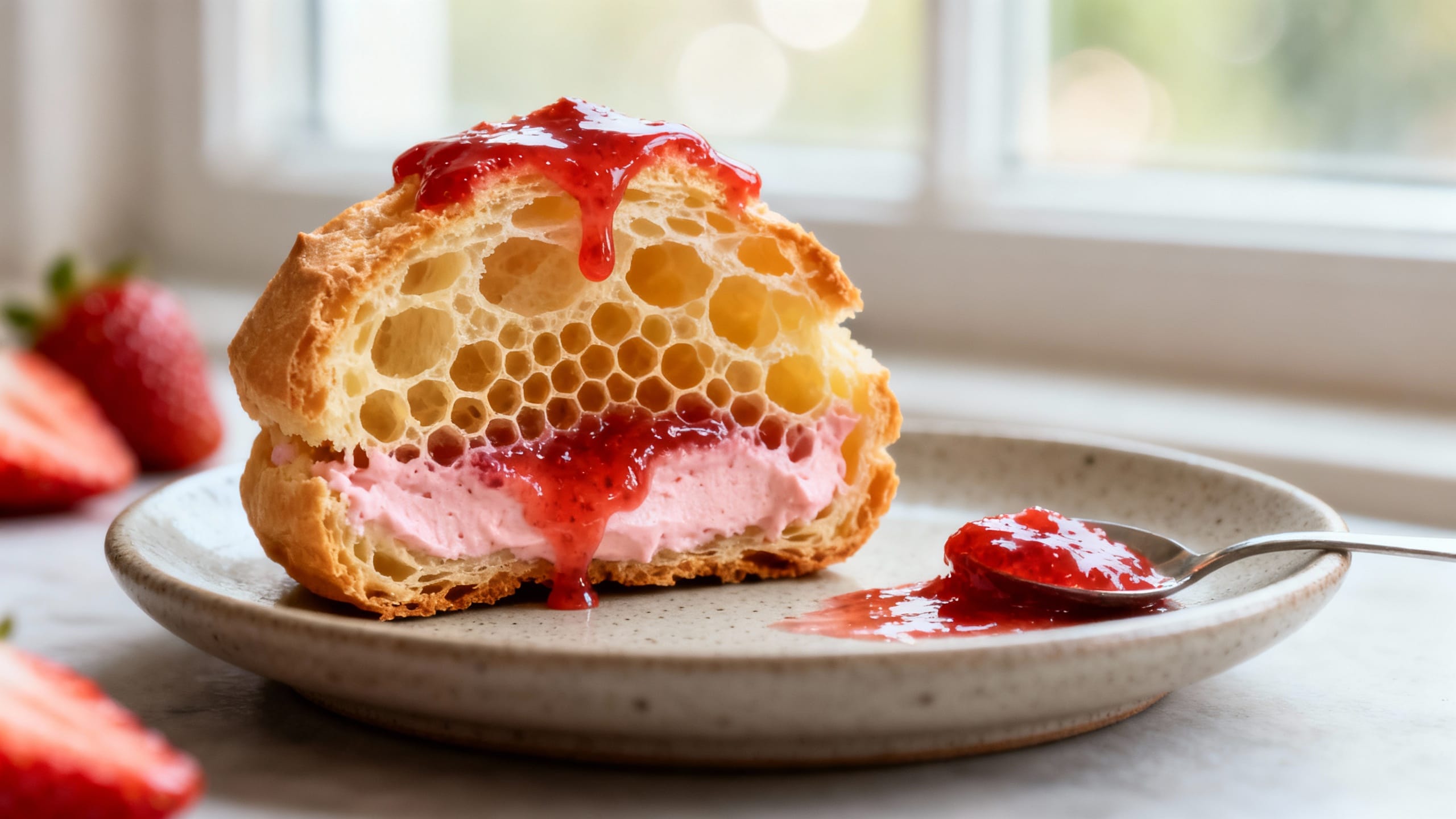- Finish with glaze. Warm strawberry preserves with a tiny splash of water just until pourable. Spoon or brush a little over each puff. Chill 20–30 minutes to set, or dust with powdered sugar right before serving.