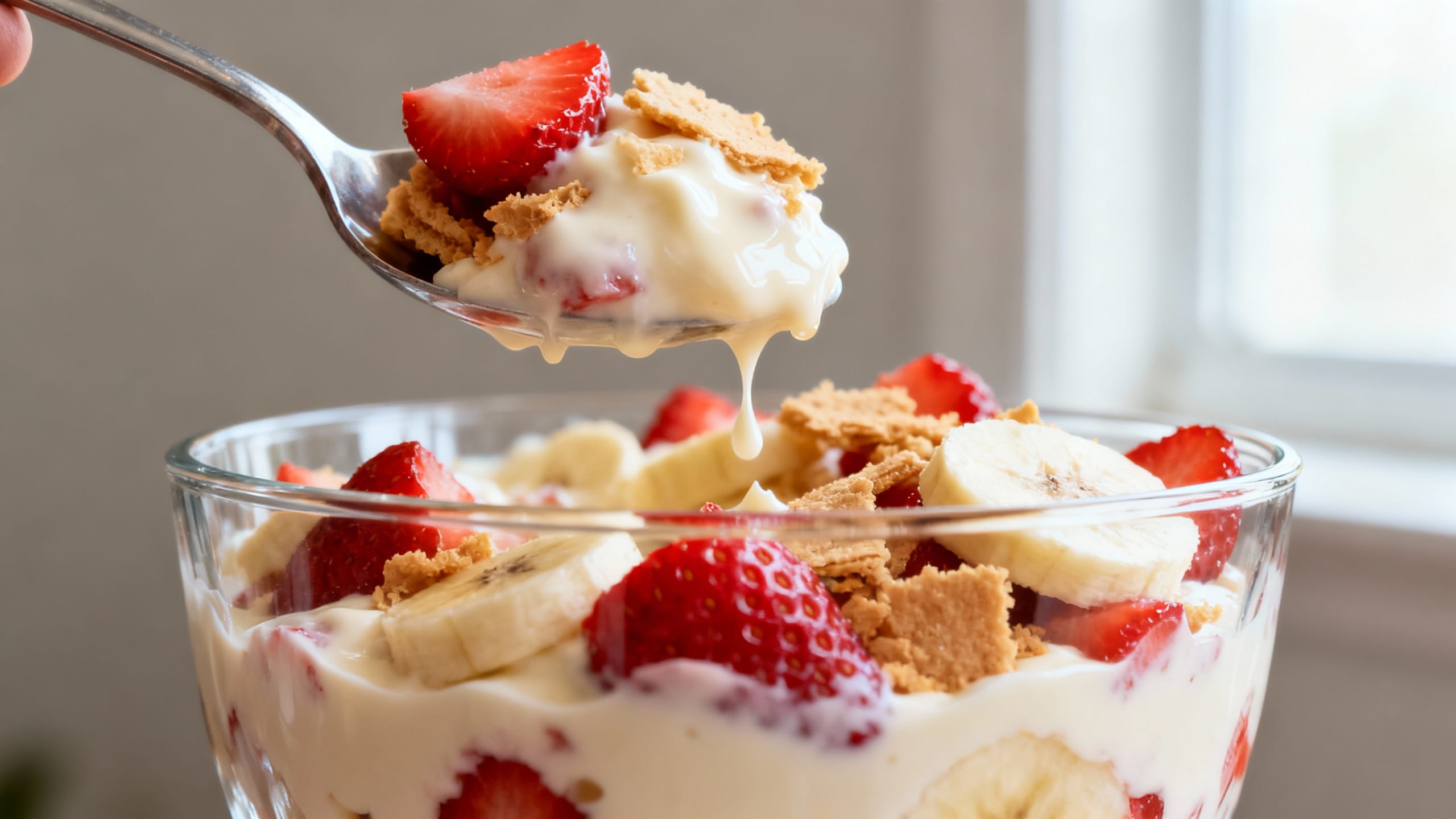 Toss sliced bananas with 1–2 teaspoons of lemon juice before layering. Also, make sure the bananas are fully covered by pudding in the middle layers—less air contact helps a lot. Even with these steps, bananas can darken slightly by day 2, so it’s best enjoyed within 24–48 hours.