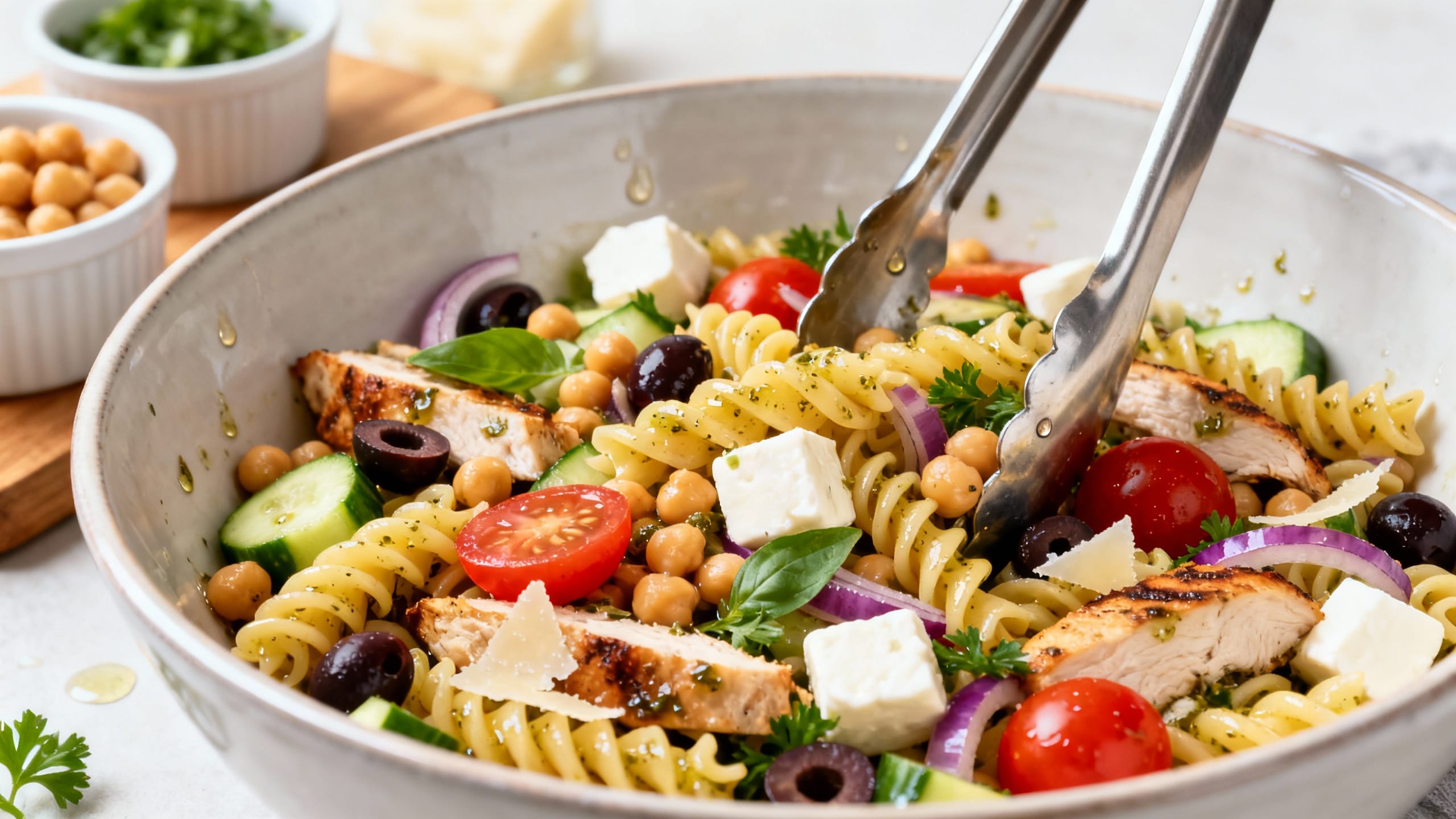 - Add the chicken and chickpeas to the bowl with the pasta, then toss to combine.