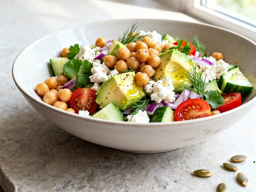 This salad is meal-prep friendly, high-protein, and actually satisfying thanks to chickpeas, feta, and Greek yogurt. The lemony dressing keeps it fresh, the avocado adds creamy richness, and it holds up well for make-ahead lunches when you store it smart.