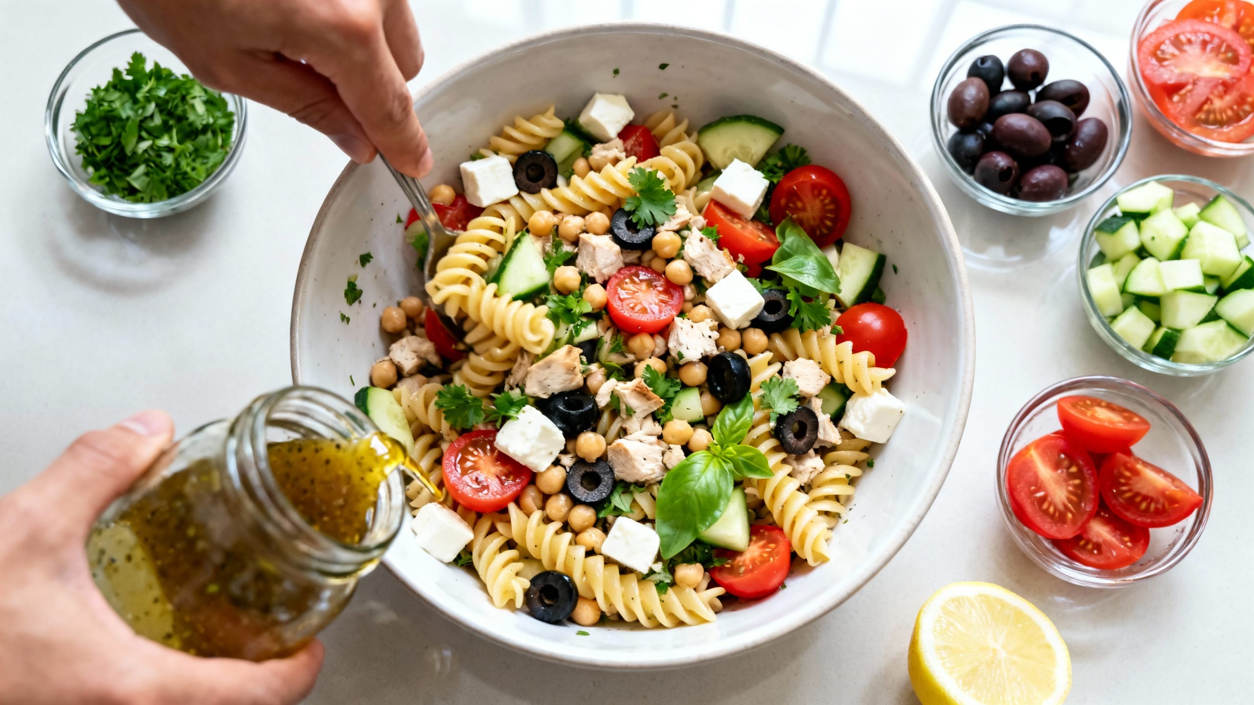 It’s high-protein because you’re stacking three sources: chickpea pasta, chicken, and chickpeas. Exact macros depend on brands and portions, but this combo typically lands you in solid meal territory—way more filling than a standard pasta salad.