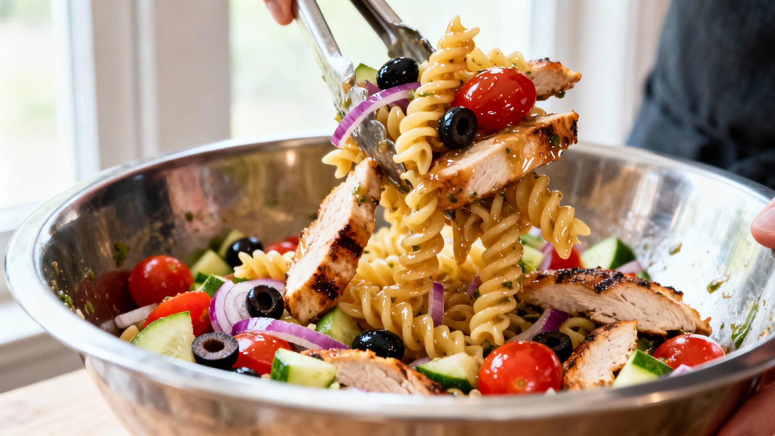 5. Add chicken, tomatoes, cucumber, bell pepper, red onion, broccoli (if using), olives, and pepperoncini. Toss until everything is evenly mixed.