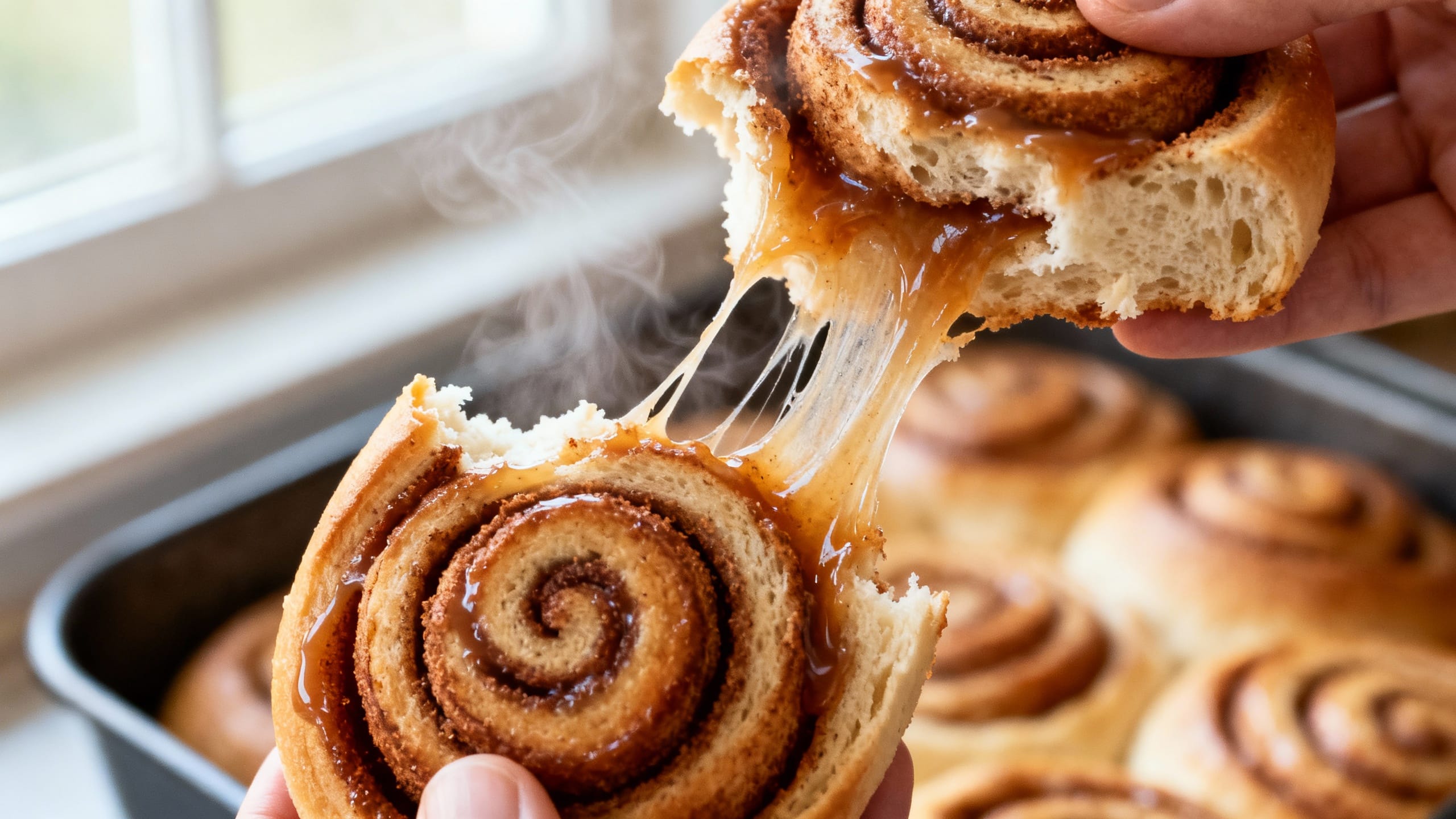 Store cinnamon rolls in an airtight container at room temp for up to 2 days or in the fridge for up to 5 days. Reheat individual rolls in the microwave for 15–25 seconds (add a tiny splash of milk if they feel dry) or warm the pan in a 300°F oven for 10–15 minutes, covered with foil.