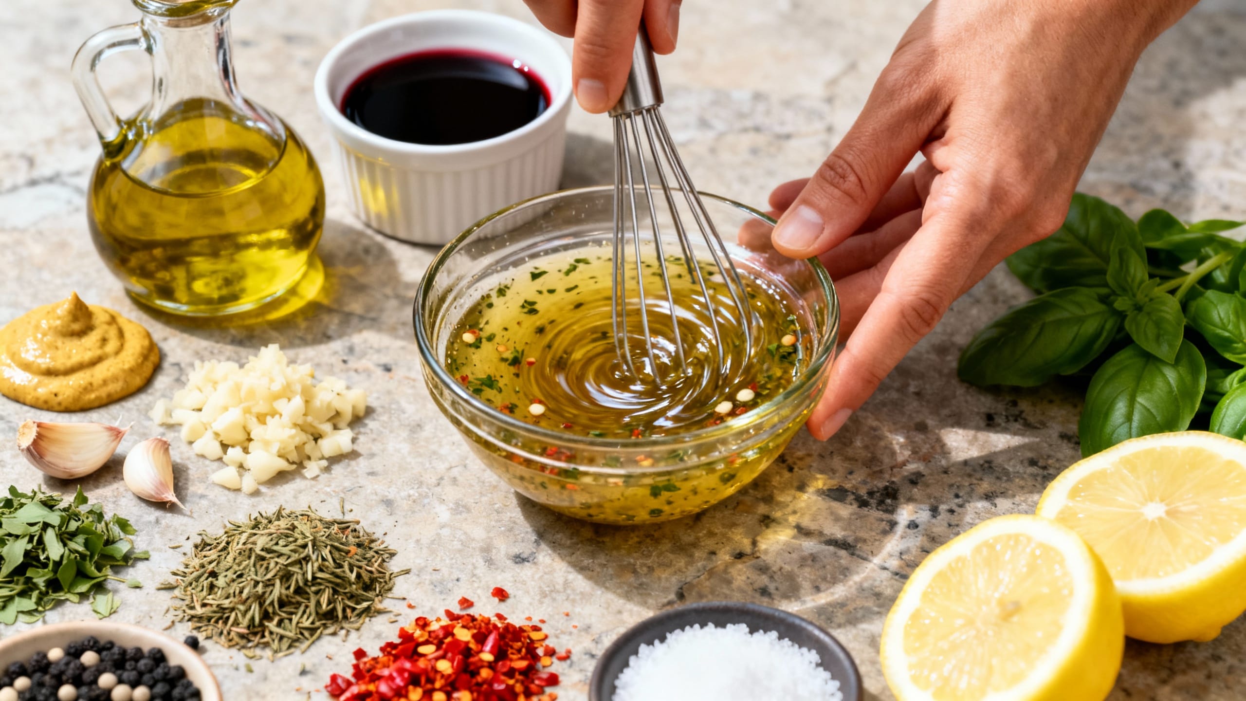 3. Slowly pour in the olive oil while whisking, or add it to the jar and shake vigorously for 20–30 seconds to emulsify.