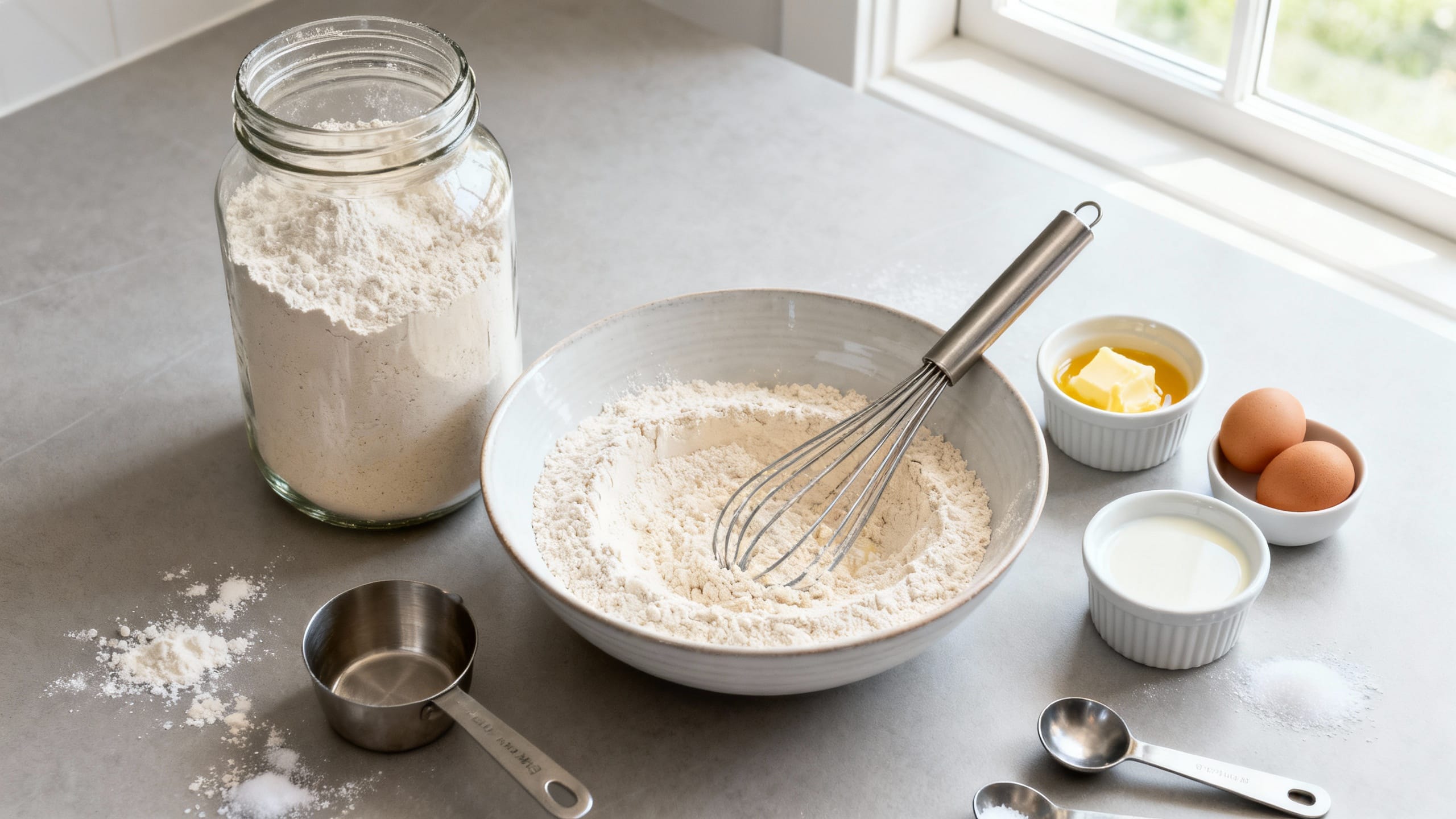 - Measure the dry ingredients. For best accuracy (especially when scaling), weigh them. If using cups/spoons, fluff flour, spoon into the cup, and level.