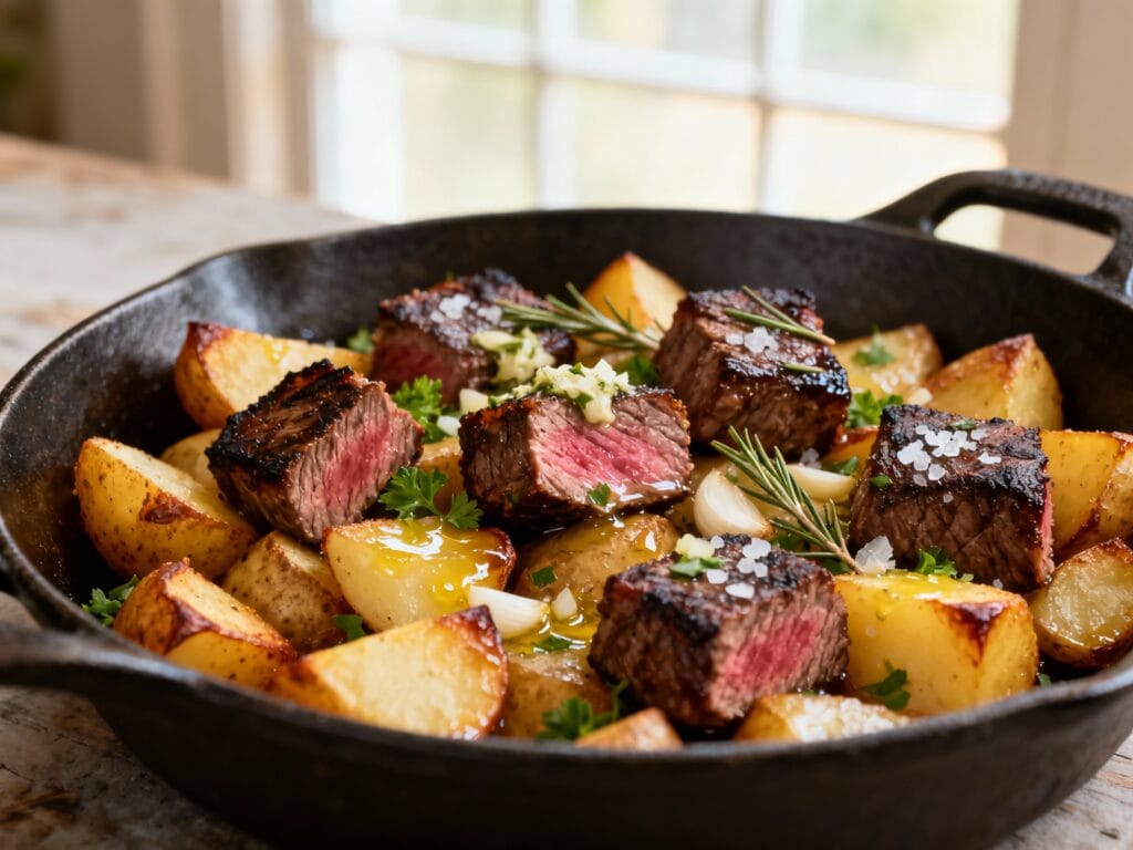 You get tender, browned steak bites, crispy-edged potatoes, and a glossy garlic-butter sauce that tastes like it came from a steakhouse—without needing a grill or a special occasion.