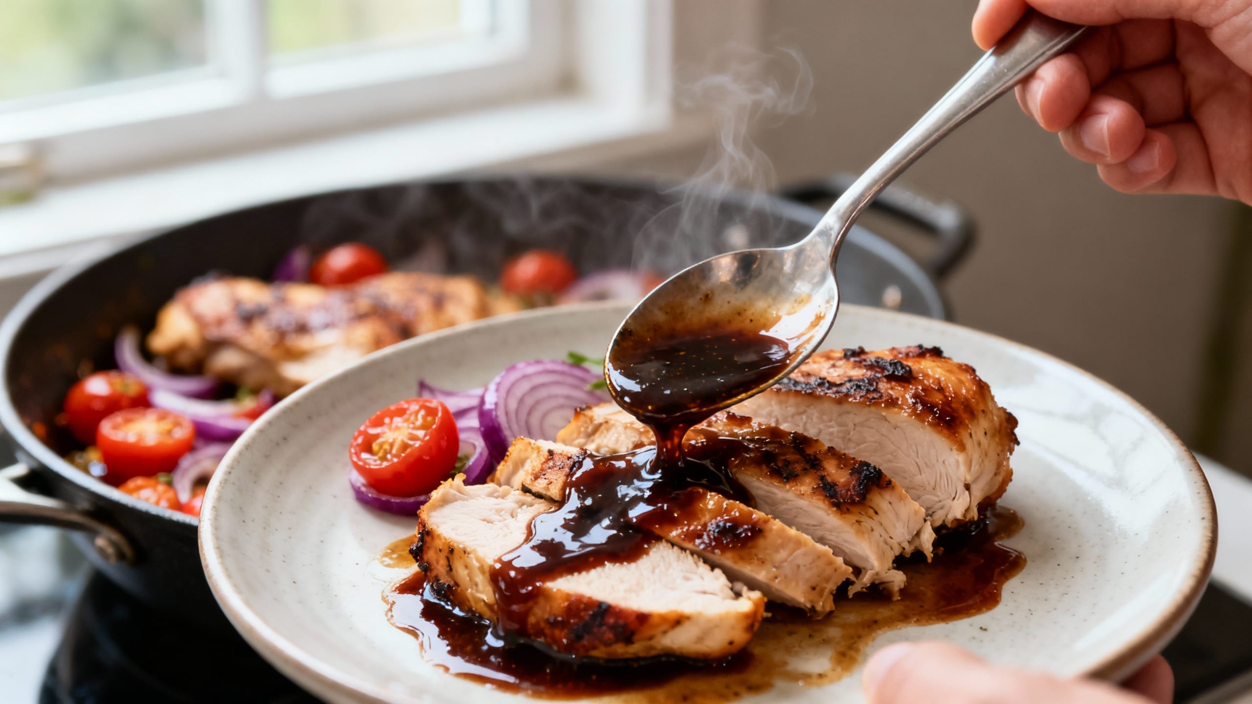 6. Return the chicken (and any juices on the plate) to the skillet. Spoon sauce over the top, cover, and simmer on low for 6–10 minutes, depending on thickness, until the chicken reaches 165°F in the thickest part.
