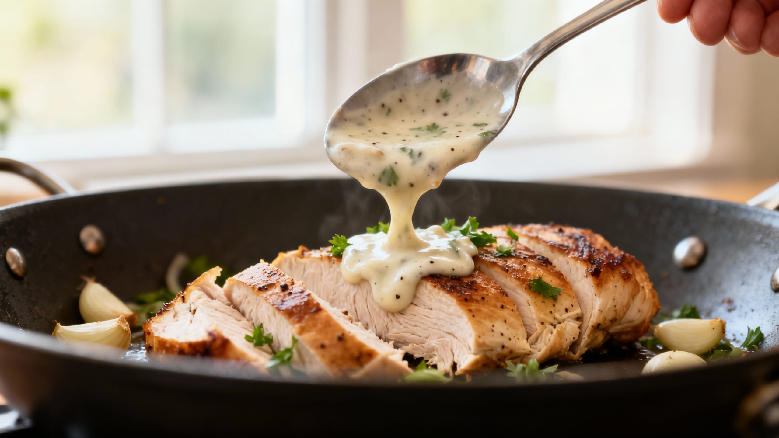 - Return the chicken (and any juices from the plate) to the skillet. Spoon sauce over the top and simmer 2–4 minutes until the chicken is fully cooked (165°F for breasts; thighs are best around 175°F for tenderness).
