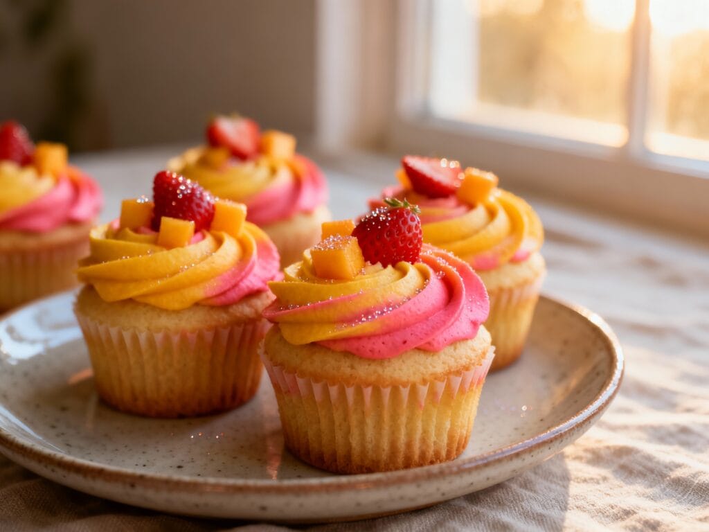These Mango Strawberry Sunset Cupcakes are basically the dessert version of golden hour: warm mango vibes, bright strawberry pops, and a frosting swirl that looks like a little tropical sunset on top. They’re the kind of cupcakes that make people stop mid-convo and go, “Wait… you made these?”