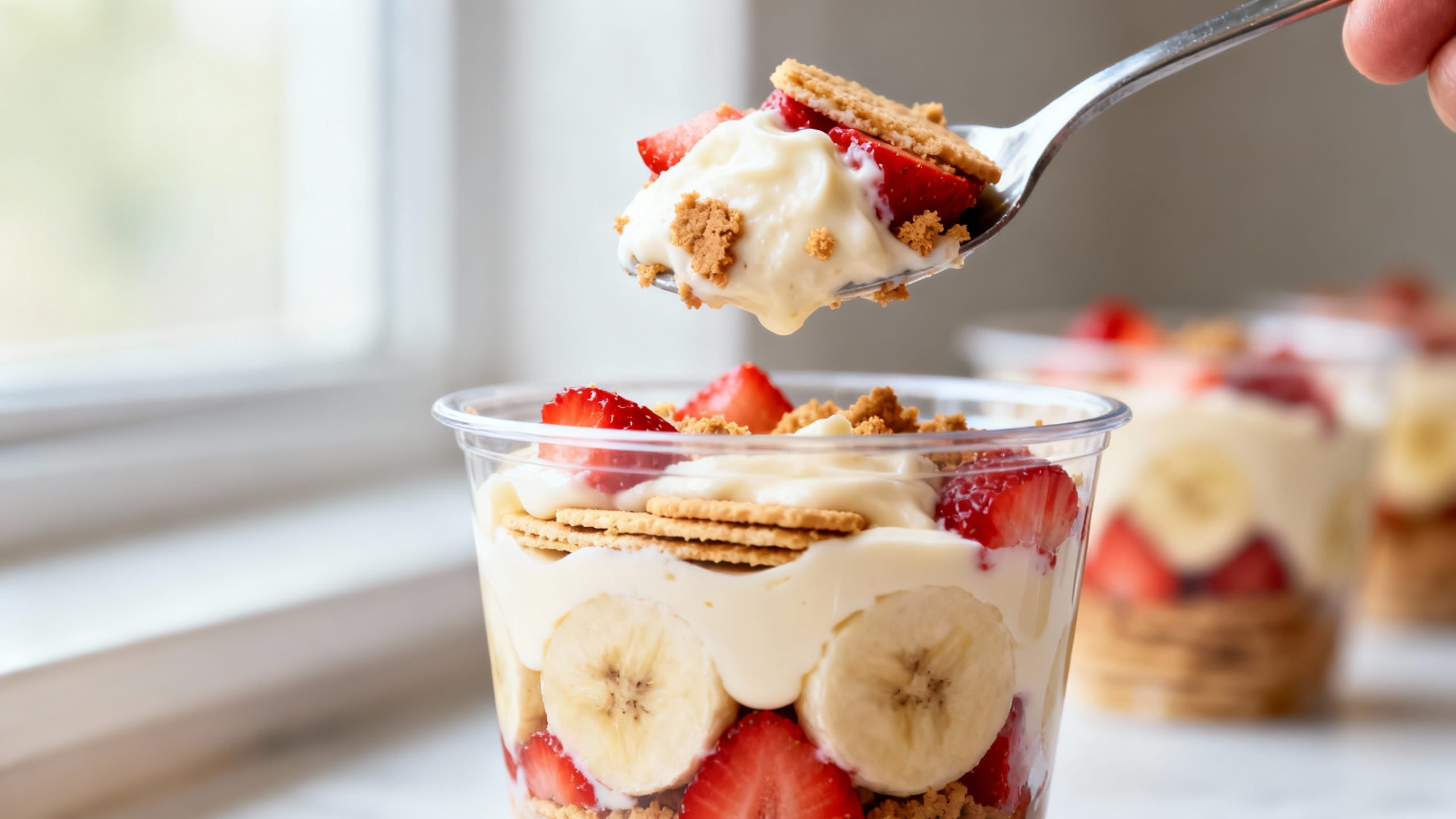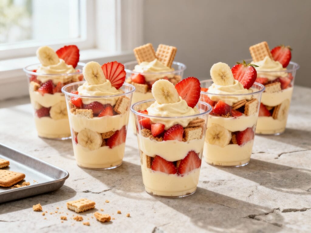 - Finish it cute: Top with a final dollop of pudding/whipped topping, a few strawberry slices, and a cookie piece or crumb sprinkle.
