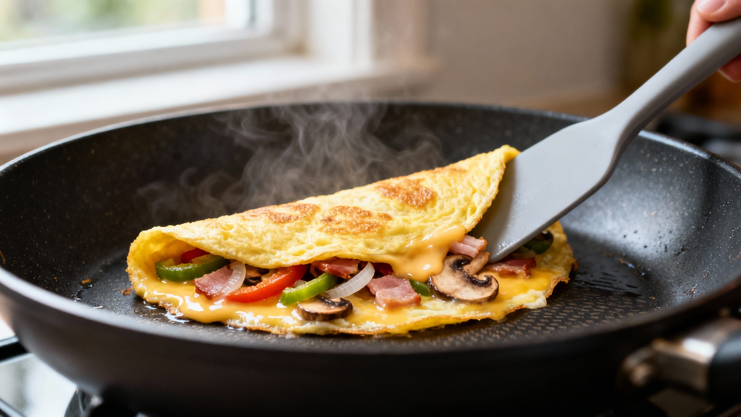 - Use the right pan size. A 3-egg omelette wants an 8–9 inch nonstick skillet. Too big = thin eggs that tear; too small = overstuffed fold.