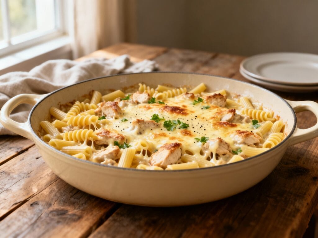 It’s a true one-dish dinner: tender chicken, perfectly cooked pasta, and a creamy, cheesy sauce all made together so the flavor builds in layers—and your sink stays mostly empty.