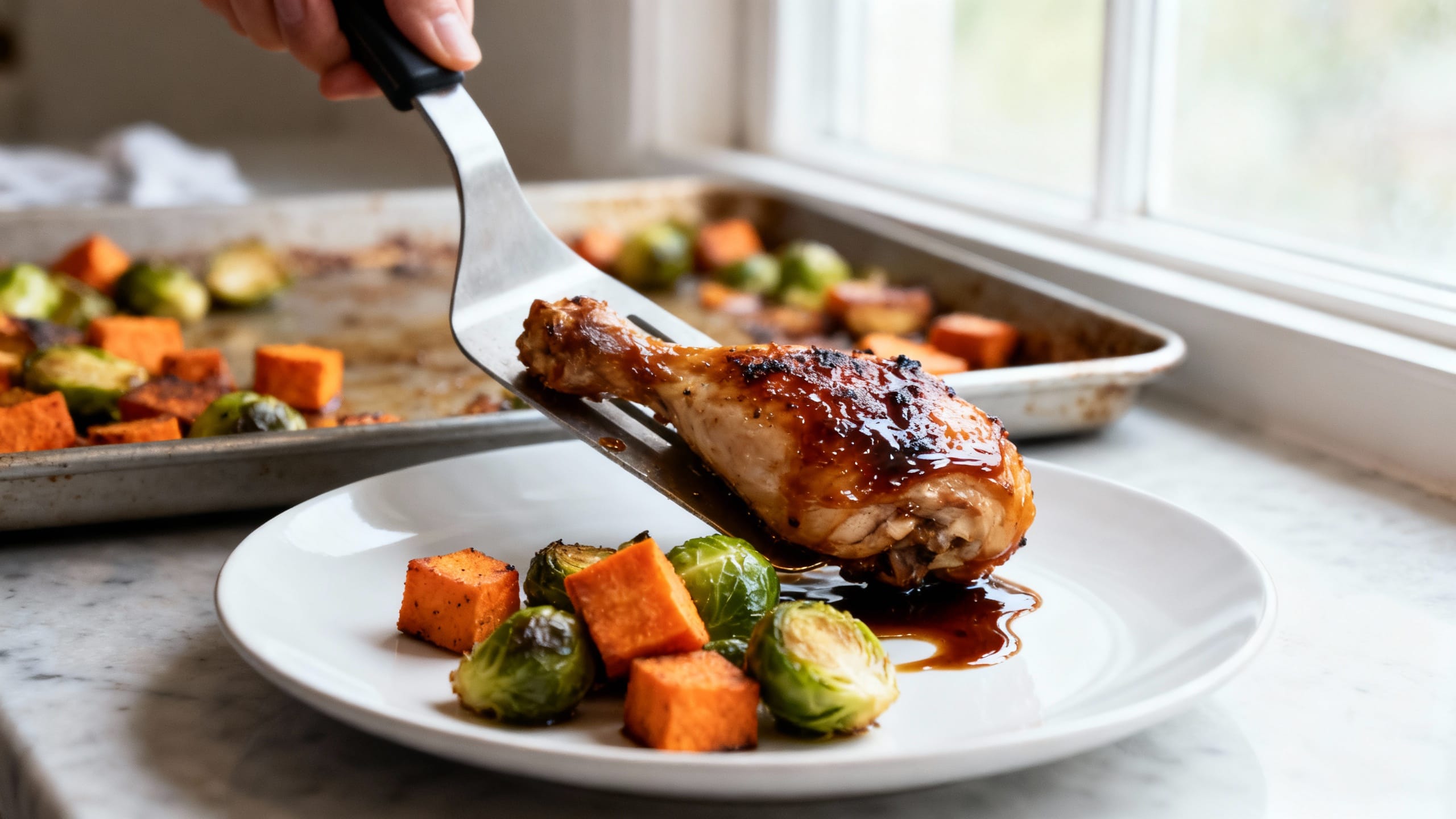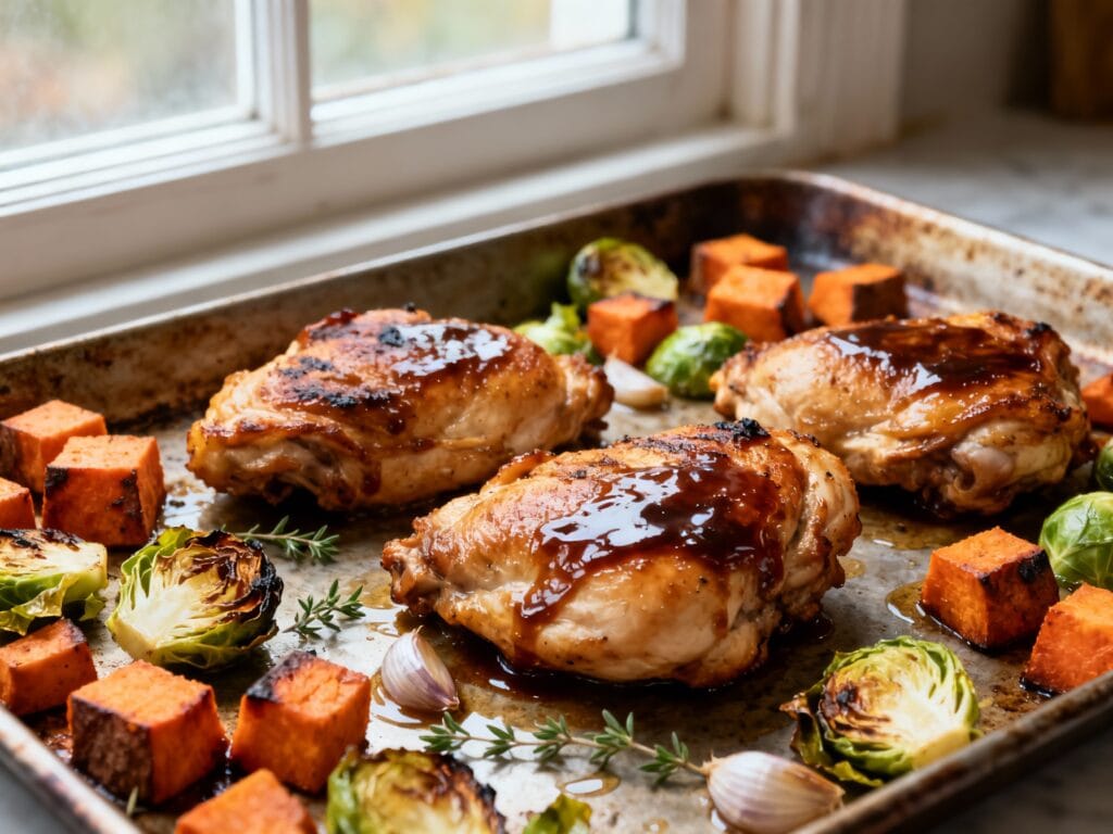 The balsamic glaze situation is the star: it caramelizes around the chicken, clings to the sweet potatoes, and turns Brussels sprouts into those crispy-edged bites everyone fights over. Bonus: fewer dishes, more chill.