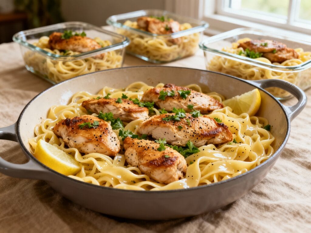 The best part? You cook the chicken and build a quick pan sauce in the same skillet, while the noodles do their thing. Portion it out, stash it, and you’ve got a ready-to-go dinner (or lunch) that reheats like a dream.