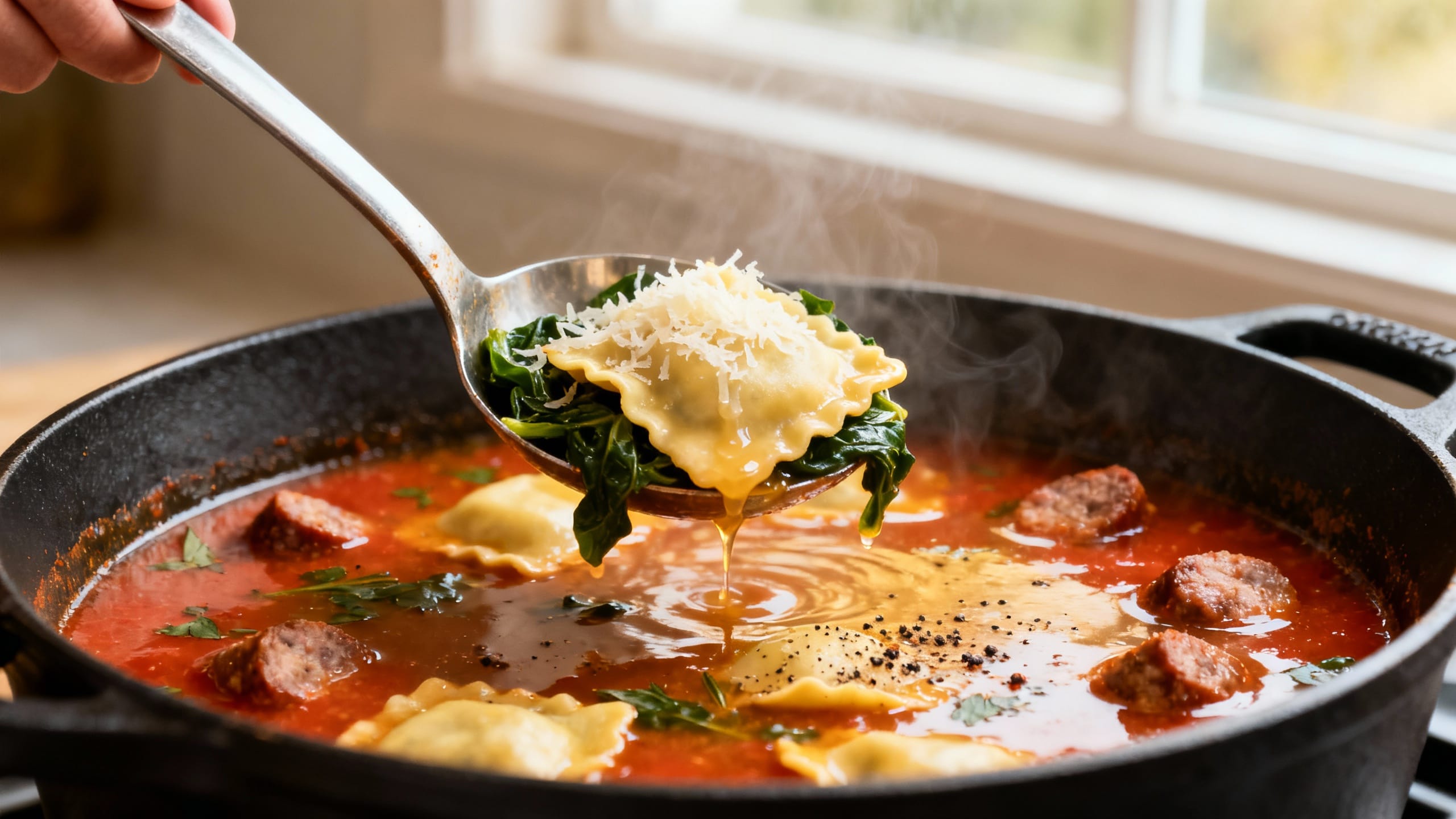 - Add ravioli near the end. Ravioli cooks fast—treat it like the “finish line” so it stays plump and intact.