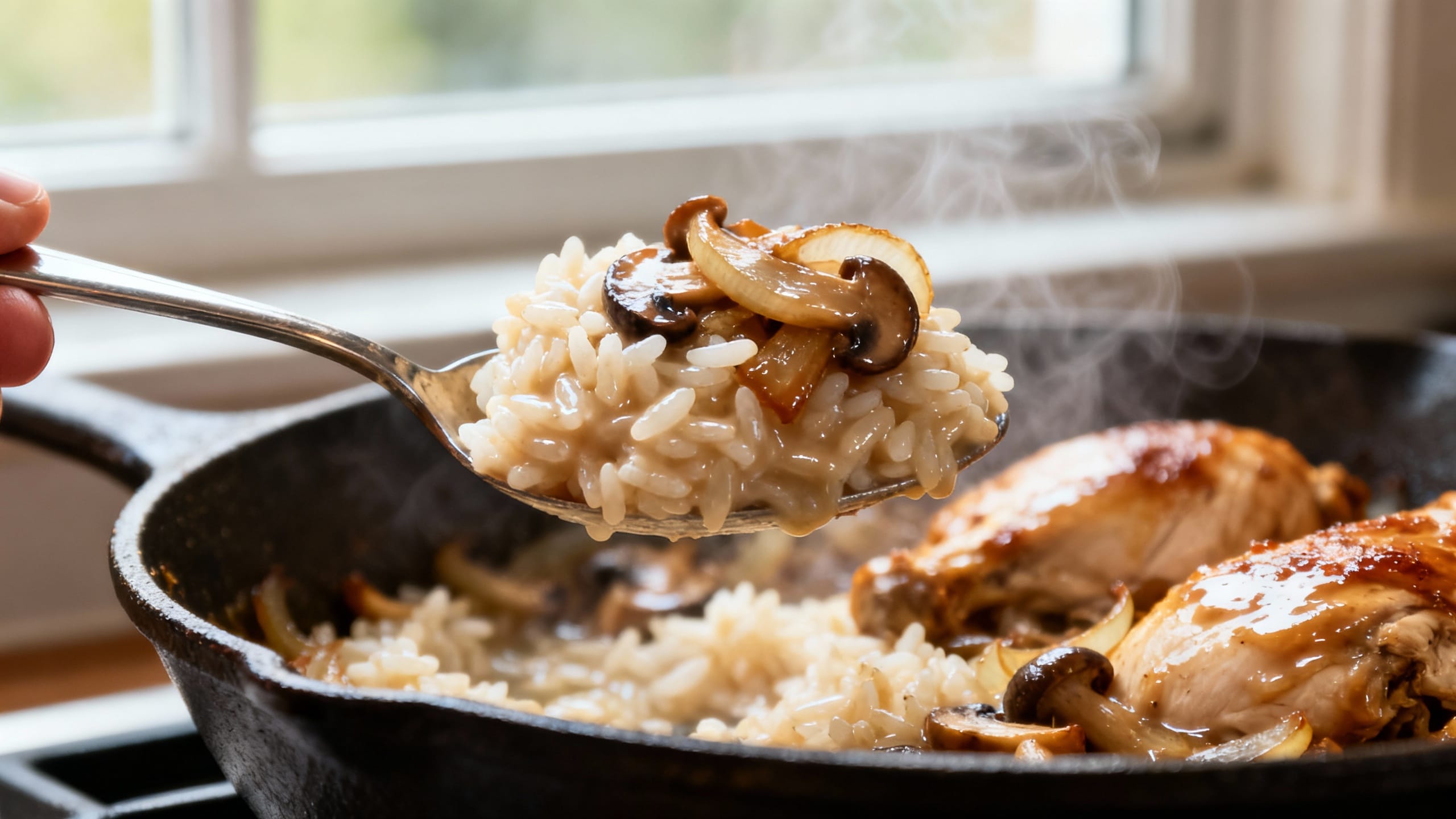 You’ll sear juicy chicken, build a quick onion-y gravy, then let the rice cook right in the skillet so it soaks up every bit of flavor. Minimal dishes, maximum comfort.
