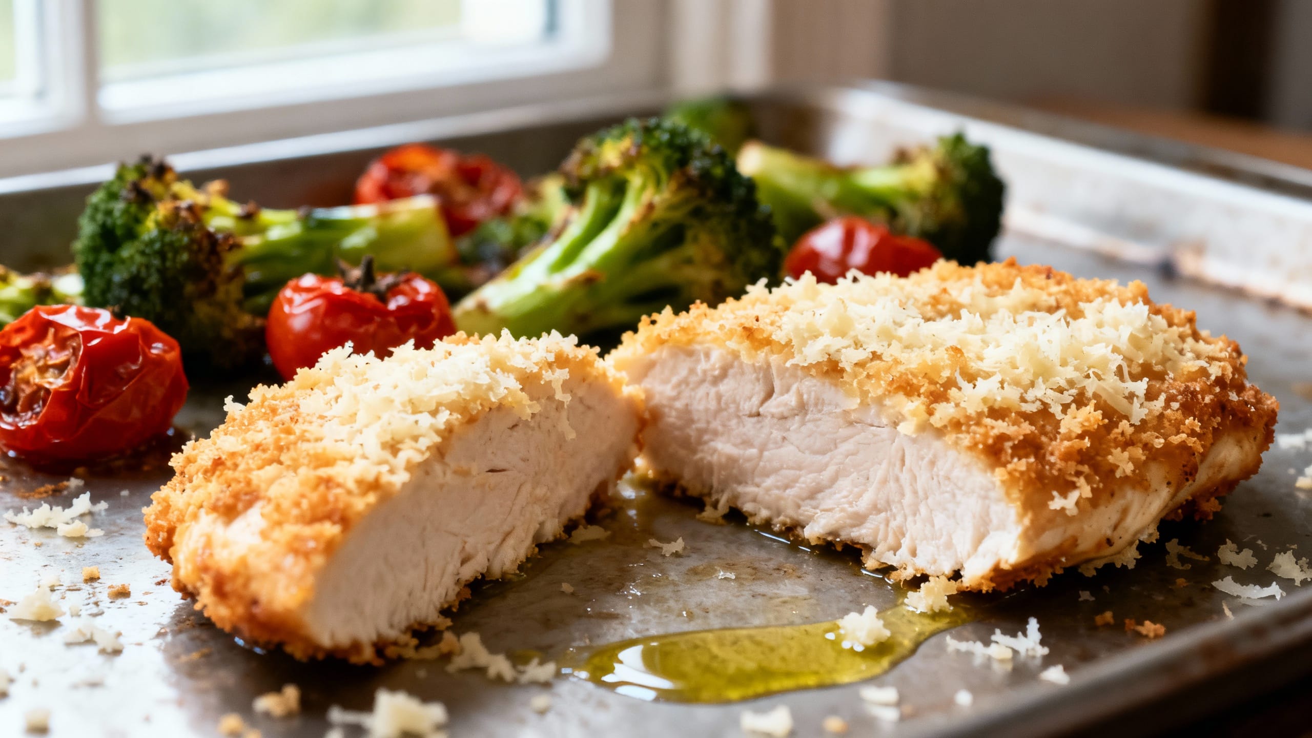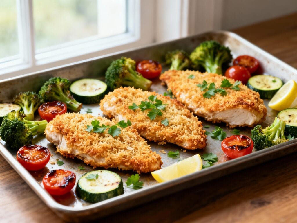 Absolutely. Slice the chicken into cutlets, mix the Parmesan-panko topping, and chop the veggies up to 24 hours ahead. Store everything separately in the fridge, then assemble and bake when you’re ready.