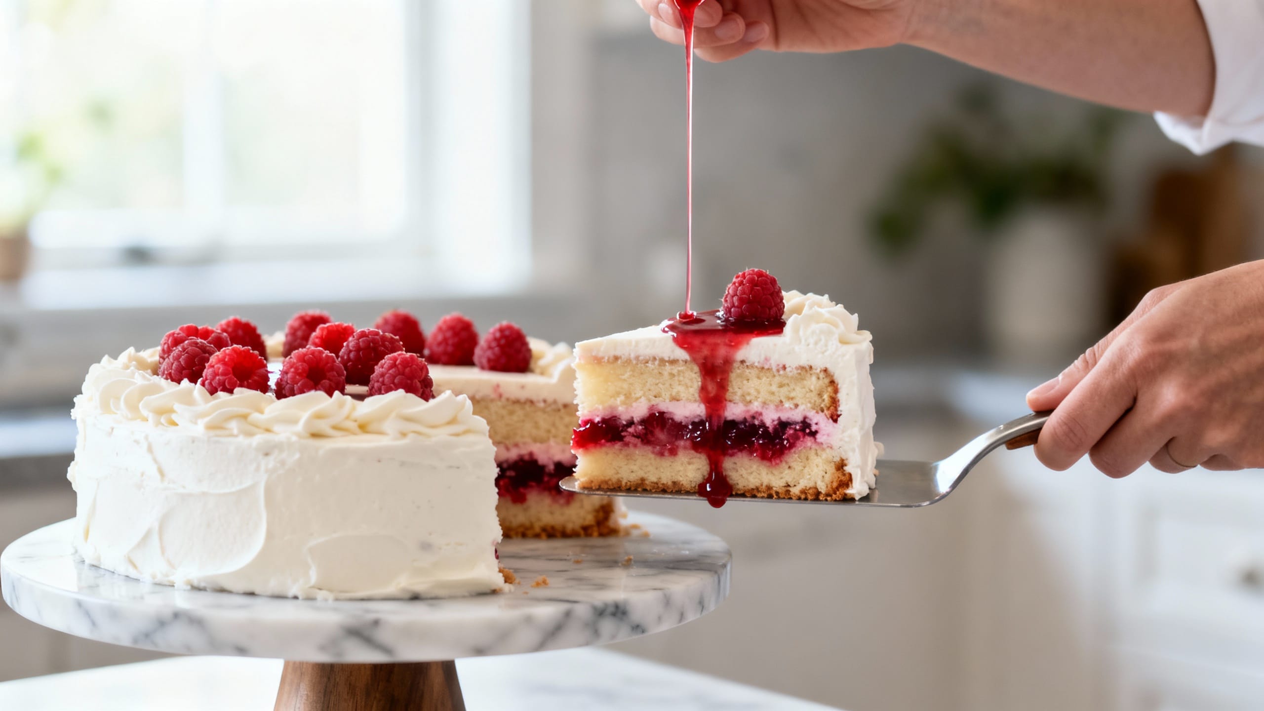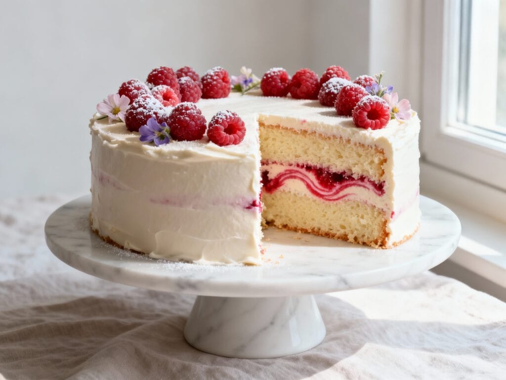 - Assemble: level cakes if needed. Spread a thin layer of whipped frosting, then swirl on raspberry preserves. Add the second layer, frost the top and sides, and finish with fresh raspberries.