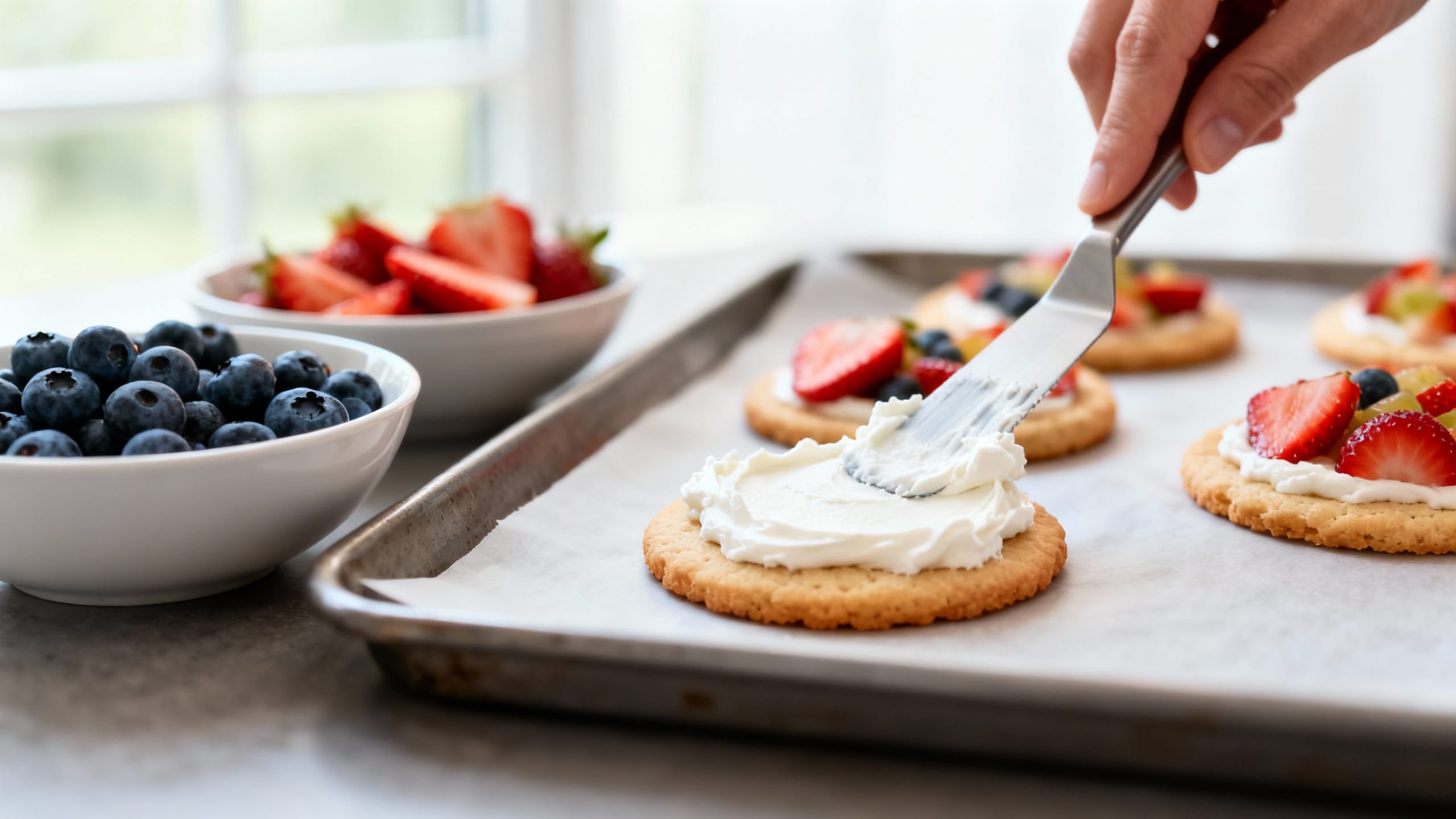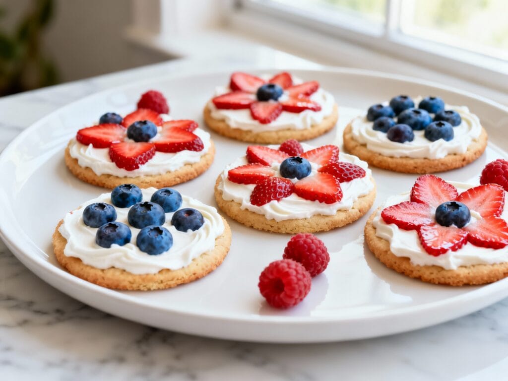 Absolutely—this is a perfect “decorate your own” setup. Adults can bake and cool the cookies, then set out bowls of frosting, blueberries, and sliced strawberries. Give kids spoons or small spatulas and let them build their mini fruit pizza masterpiece.