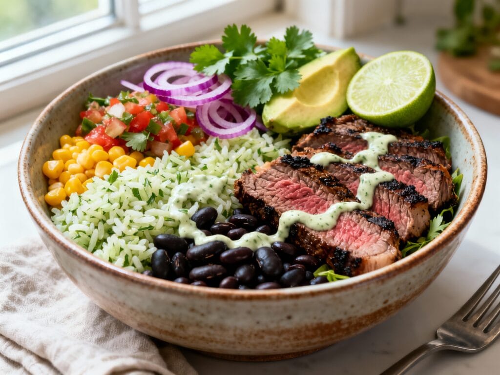 We’re talking tender seared steak, cilantro lime rice, a quick black bean-corn mix, and a creamy lime sauce that ties it all together. Build-your-own bowl energy, but make it weeknight-friendly.