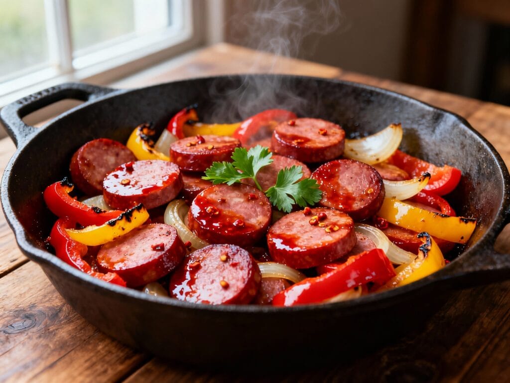 If you need a fast, flavor-packed dinner that hits like your favorite takeout but cooks in one pan, this Spicy Smoked Sausage Skillet Dinner With Peppers and Onions is it. It’s smoky, a little fiery, and full of sweet, jammy peppers and onions that basically melt into the sausage.