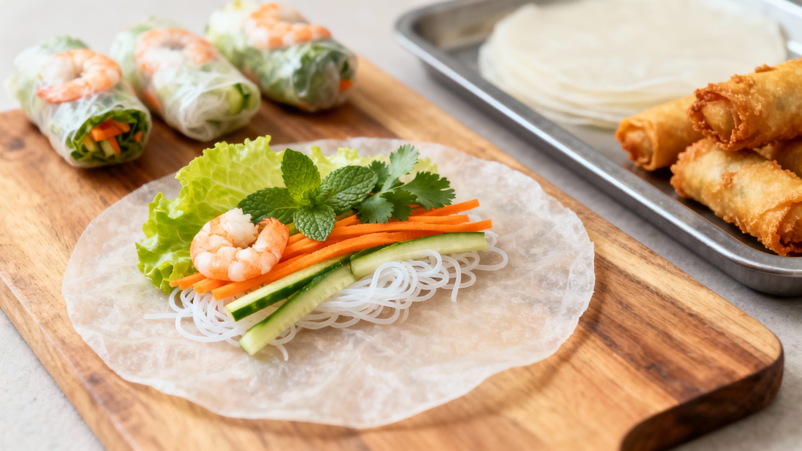 Fried: yes. You can assemble and refrigerate the uncooked rolls for up to 8 hours (covered so they don’t dry out), then fry when ready. Fresh: prep all components ahead, but roll close to serving; rice paper can dry out or get sticky if it sits too long.
