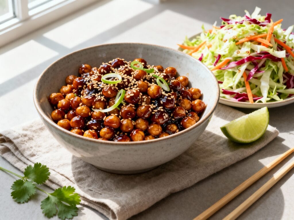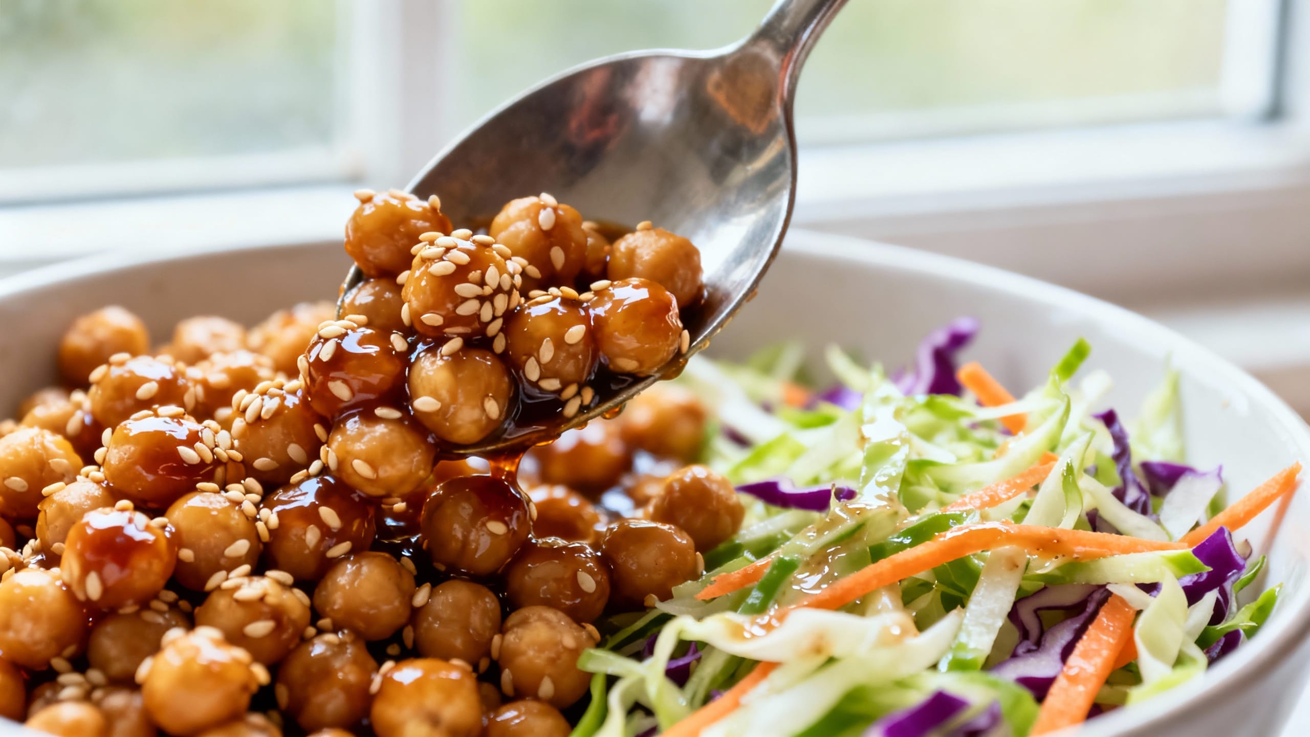 You get sticky, caramelized sesame chickpeas (no deep-frying required) paired with a fresh, punchy slaw that cuts through the sweetness—so the whole bowl tastes balanced, bold, and not heavy.